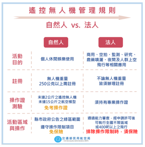 葉局長提醒,自然人僅可於民航局及市府公告禁限區域外,遵守相關法規操作遙控無人機;政府機關(構)、學校或法人,如因業務需要,則可透過活動申請,於公告禁限區域飛行並排除相關操作限制。更多相關資訊可至交通部民航局遙控無人機管理資訊系統( https://www.caa.gov.tw/ )、下載「DroneMap」遙控無人機空域查詢APP,或至市府交通局網頁( https://www.traffic.taichung.gov.tw/ )遙控無人機禁飛場域查詢。(6/28*13)*交通局