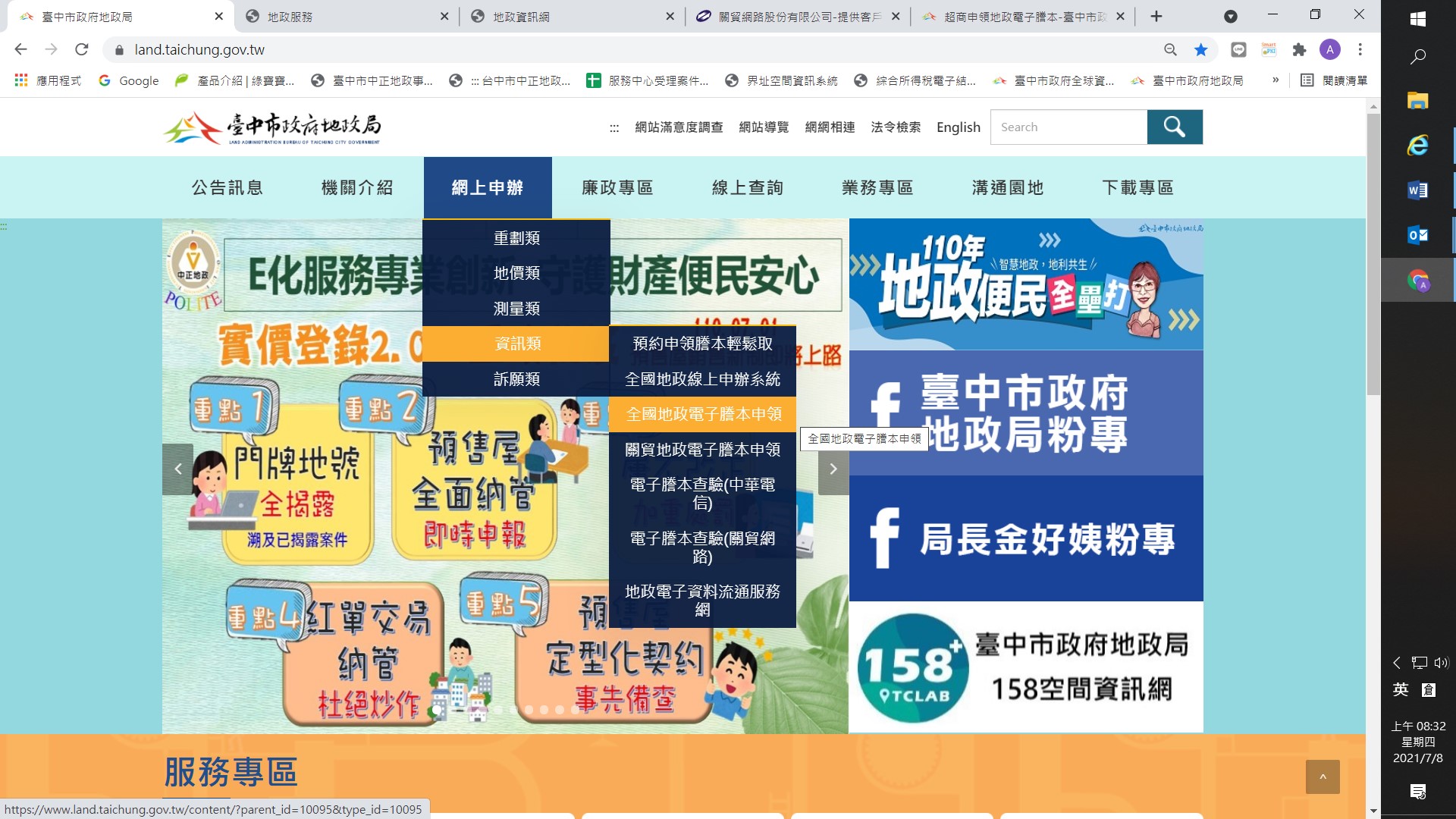 新冠肺炎疫情嚴峻,為減少不必要移動,台中市政府地政局呼籲民眾多加利用地政線上服務,如地政電子謄本、土地建物參考資訊或簡易登記案件申辦、線上聲明登錄等服務,在家動動手指便能輕鬆完成地政業務申辦,安心在家對抗新冠病毒。