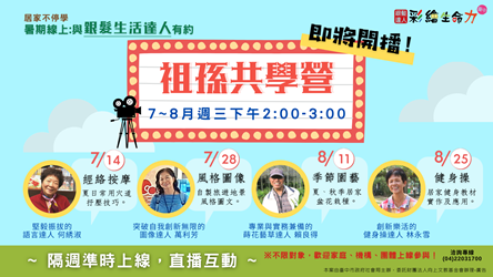 因應新冠肺炎疫情,中市長青學苑自5月13日起停課,但在家防疫的長輩們學習動力不減,社會局及各區公所聽到長輩心聲,啟動長青學苑線上課程,鼓勵長輩拿起手機平板使用視訊,將教室搬回家。此外,社會局特別委託向上文教基金會辦理銀髮達人計畫,推出暑期祖孫共學營直播,歡迎祖孫一起上線學習手藝。