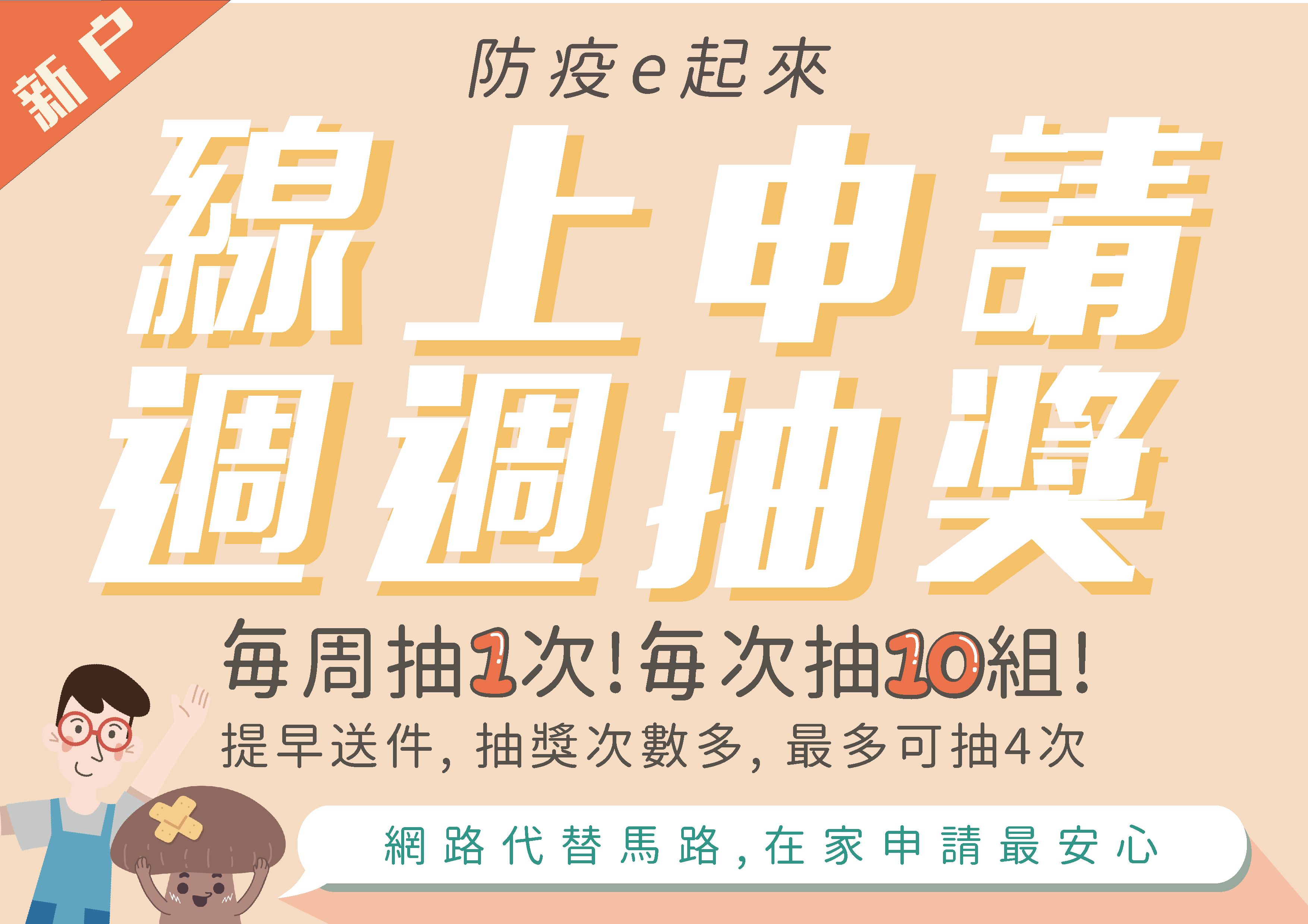 另外,今年因應新冠肺炎疫情,為鼓勵民眾線上申請,市府加碼於受理期間提供線上申請抽獎活動,週週抽獎(4),每週抽10組贈送精美宣導品,提早送件民眾抽獎次數越多,最多可以抽4次。