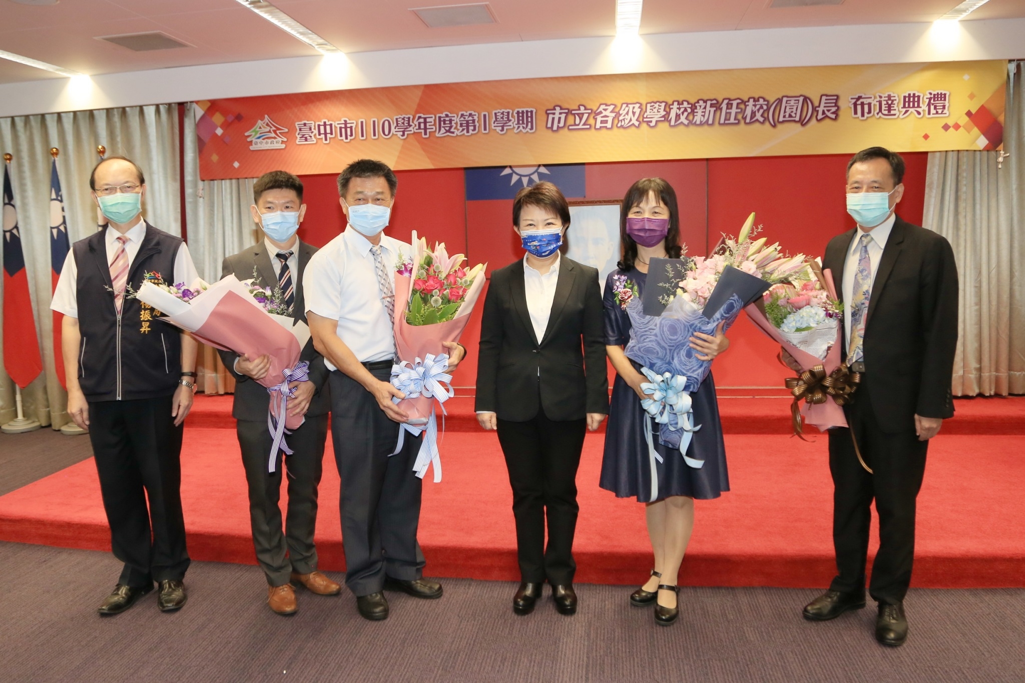 「良師興國!」盧市長提到,今日5位即將退休的校長,將一生奉獻給台中的教育,成就每個孩子,她心懷感恩與感謝,也拜託各位校長退休後繼續為教育努力,並祝福退休生活順心愉快;另外也祝福新任、連任校長任重道遠,將教育當作重責大任,將台中的孩子交給優質的教育家手中,她非常有信心,期待校長們全力以赴。