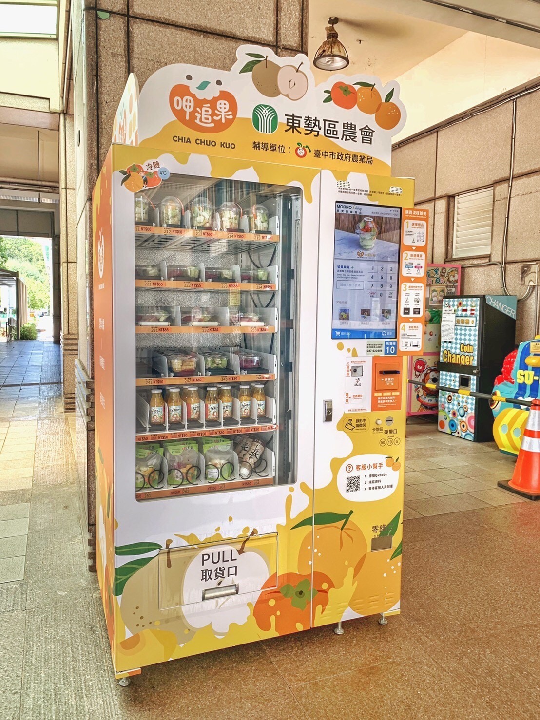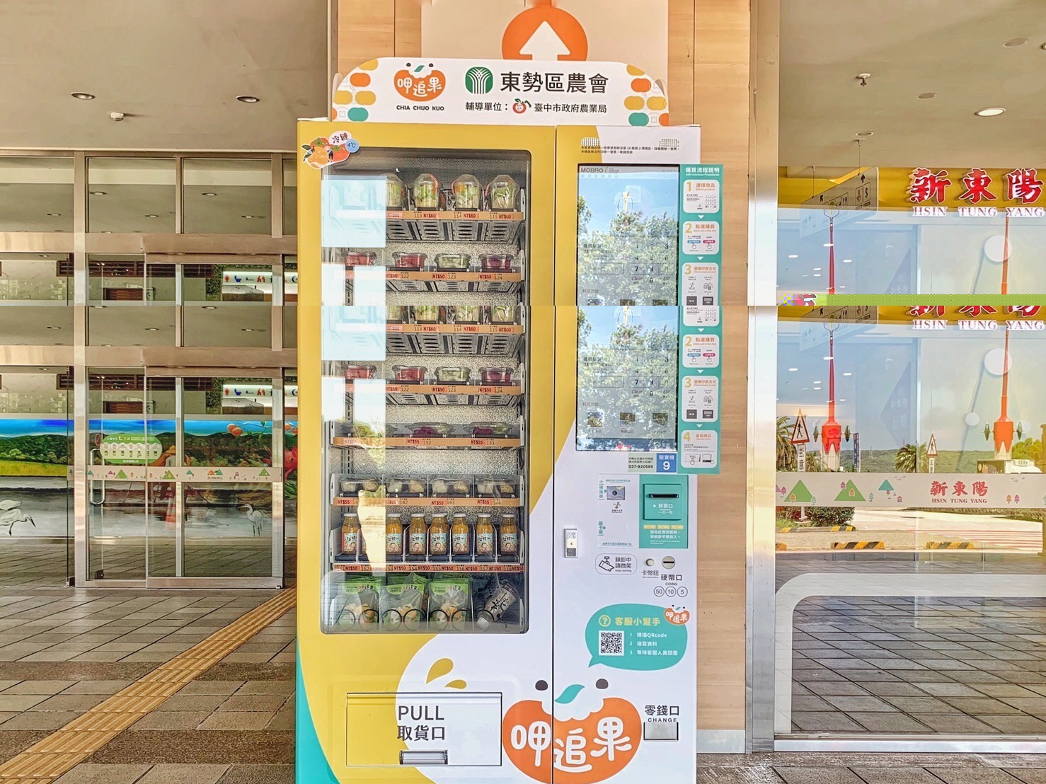 因應COVID-19疫情影響下,減少人與人接觸及排隊的「零接觸」消費模式盛行,台中市政府農業局積極輔導東勢區農會蔬果截切場,共同推出「呷追果-鮮果智能販賣機」,首波於西湖服務區北站與南站亮相,吸睛可愛的外型裡,販售截切水果單品袋、水果拚盤及鮮果原汁等在地優質水果產品,提供消費者更便捷的智慧科技服務,拓展零接觸的農產品安心銷售通路。