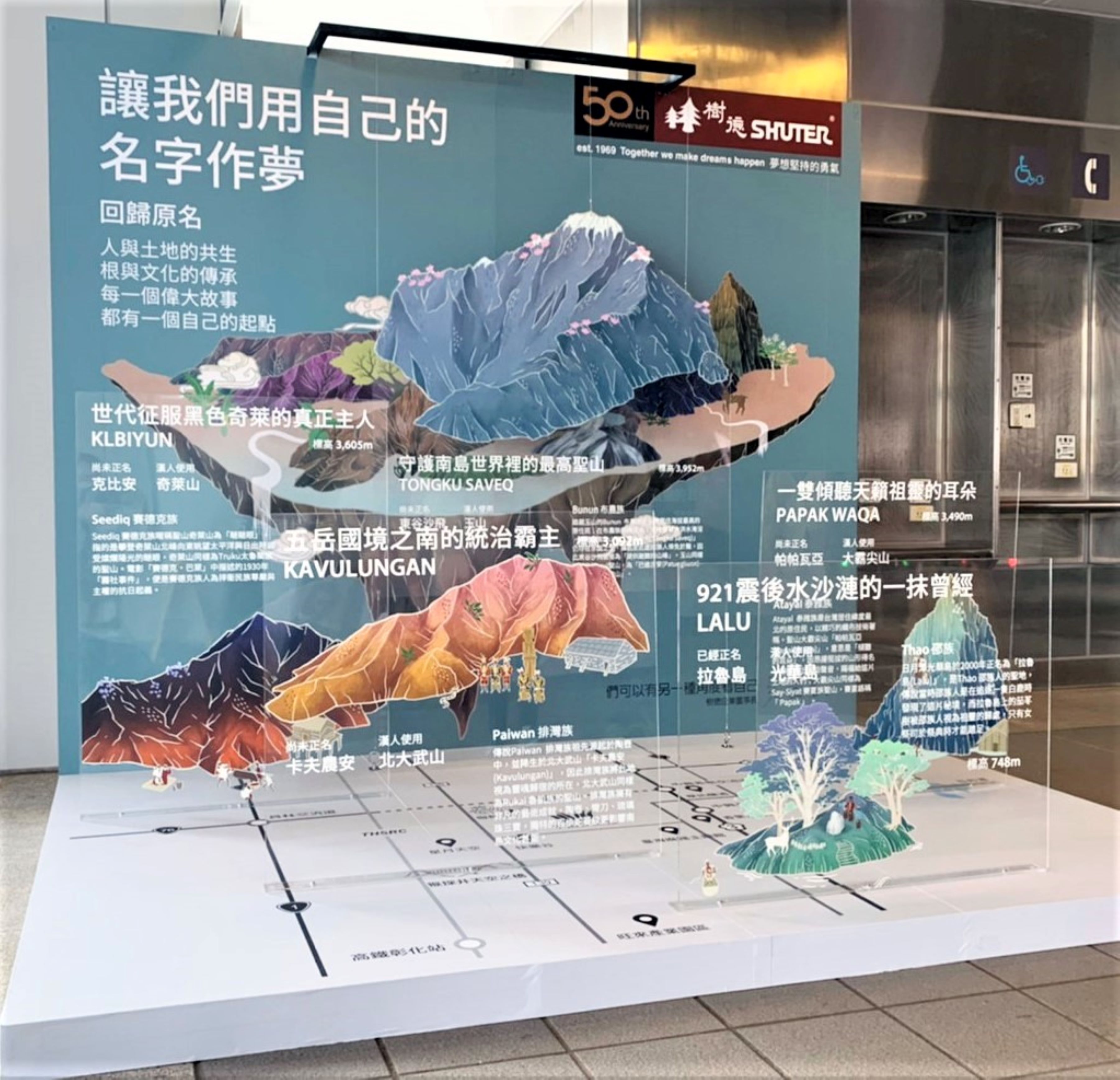 台中捷運公司表示,「幸福角落」邀請企業於捷運站內設置裝置藝術,第一波活動為樹德企業即日起於捷運大慶站及高鐵台中站展出。其中,大慶站主題為「讓我們用自己的名字作夢」,以台灣5座時常出現在人們日常生活印象中的山作為主題,包括玉山、大霸尖山、奇萊山、北大武山、拉魯島(光華島),每座山對與之共存的原住民朋友都有著獨一無二的神聖意義,不僅呈現他們的生活方式,更表現出族群特有的崇拜價值,也透過裝置藝術傳達給旅客這些地方有著自己的名字、自己的故事。