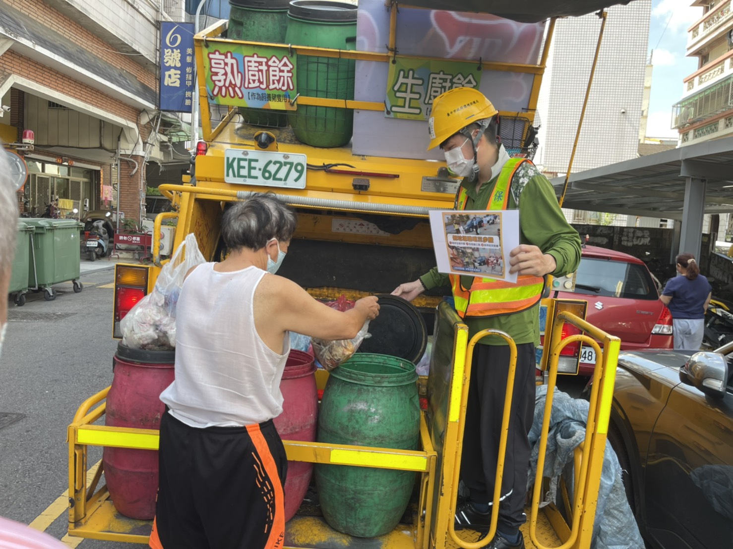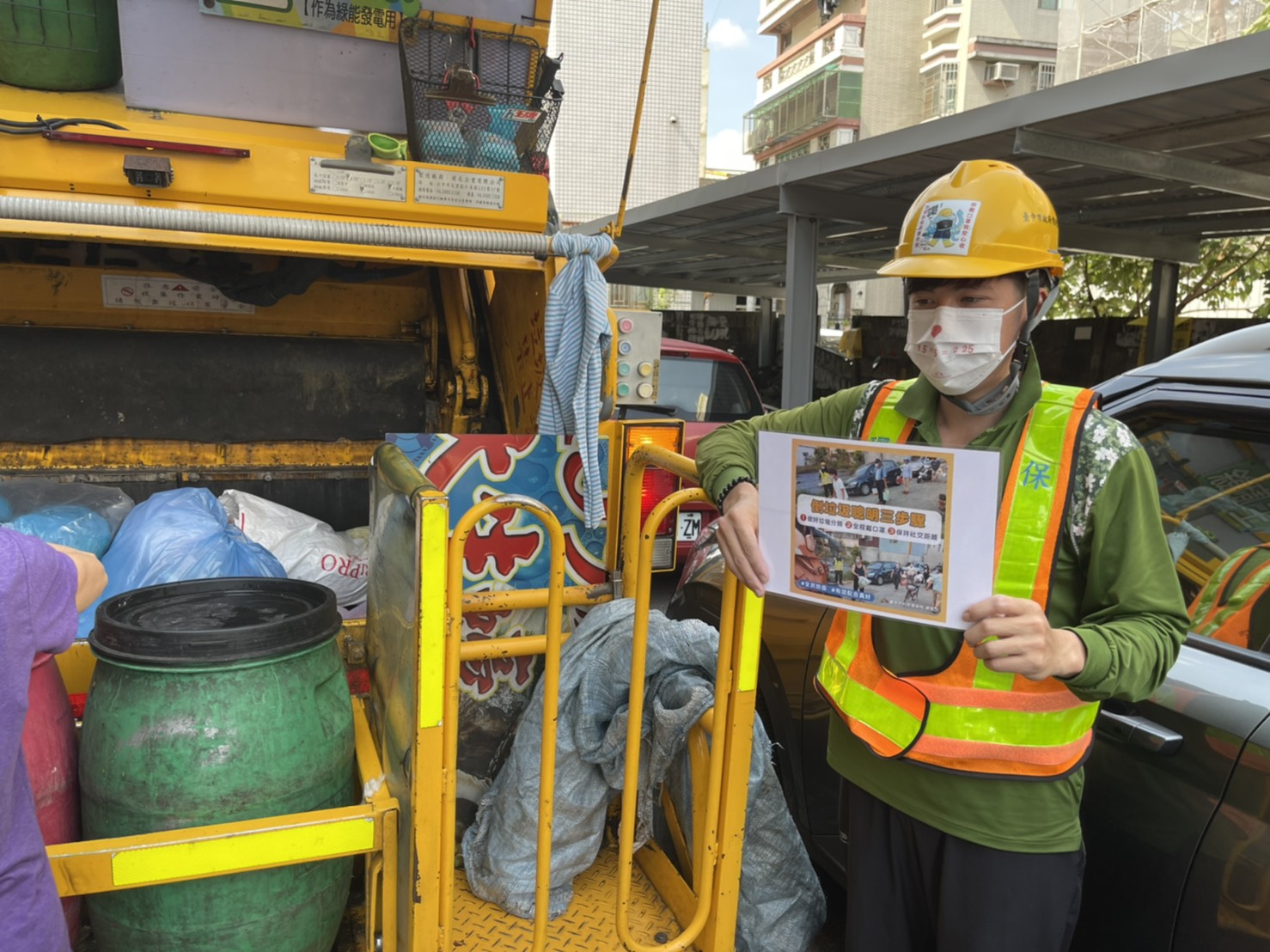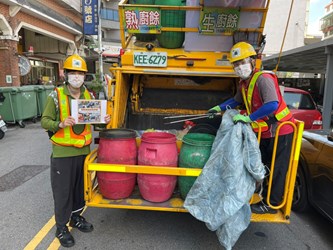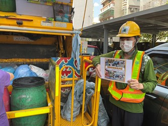 環保局進一步指出,為配合市府「一個前提、兩個態度」原則,在確保防疫安全的前提下「穩健式解封、漸進式鬆綁」,因此環保局全體清潔人員於9日、10日佩戴起市府限量特製版的「愛的社交距離」口罩,化身為「社交距離宣導員」,宣導民眾外出傾倒垃圾時,仍應保持1.5公尺的安全社交距離,並出門全程佩戴口罩、勤洗手,才能降低傳染風險,一起守護你我健康。