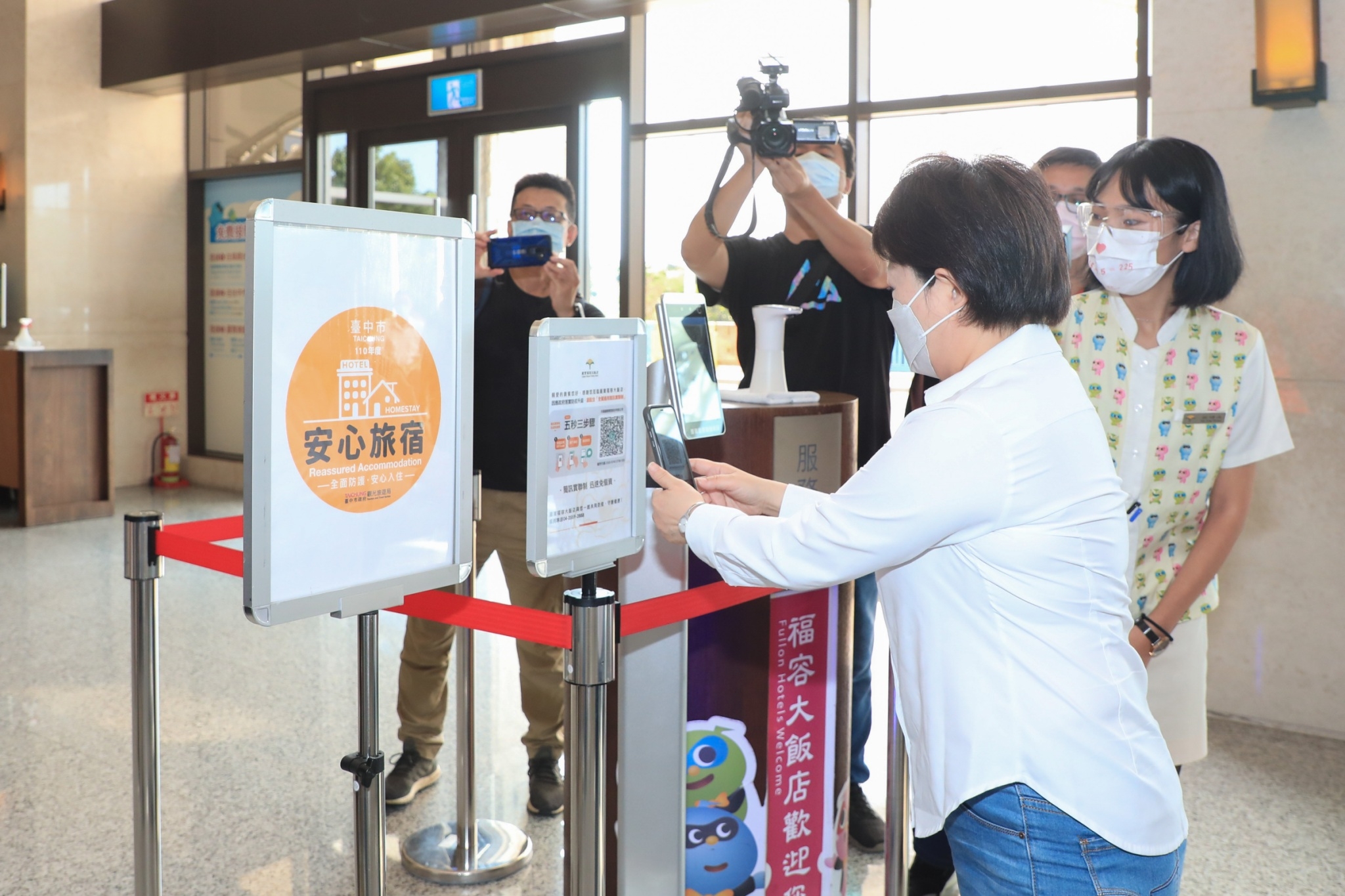 月眉國際開發股份有限公司董事長陳志鴻說明,麗寶福容飯店落實安心旅宿作為,除向旅客揭露「安心旅宿」認證標章及防疫作為外,民眾下車後由服務人員進行手部消毒、進入飯店大門進行量測體溫及1922實聯制、接待櫃台設置透明隔板;另外,服務人員皆佩戴口罩或面罩,並加強客房消毒區域等,落實「安心旅宿」規範。