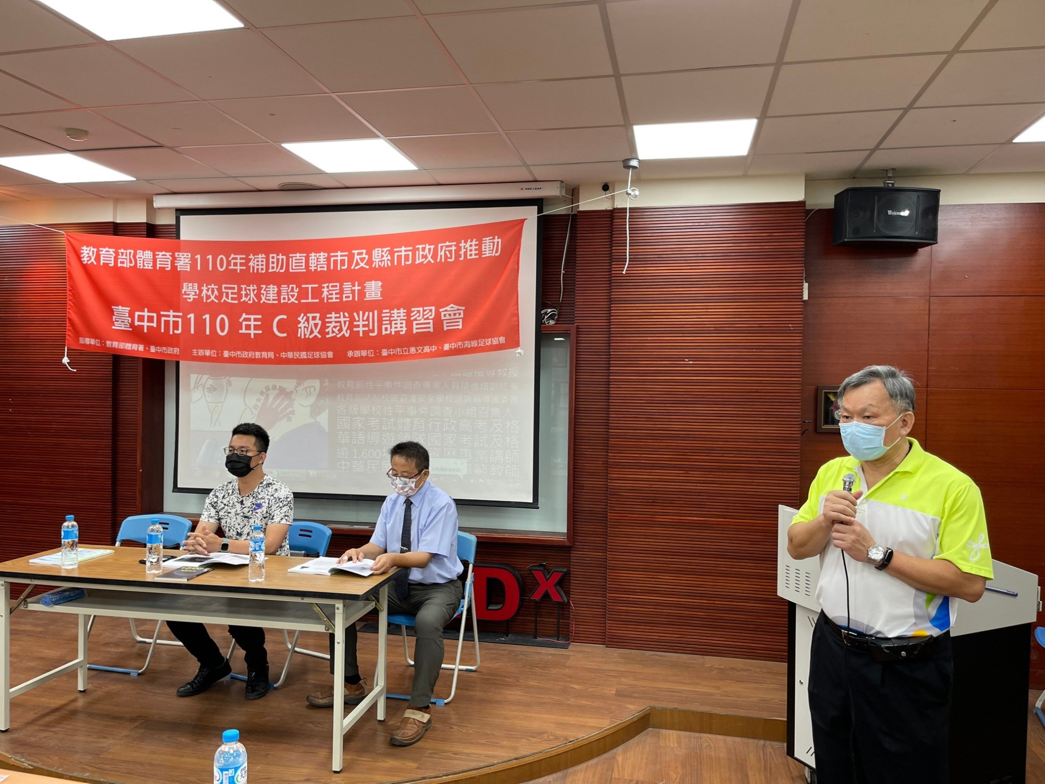 今日研習活動,邀請教育局體育保健科股長李有峻、惠文高中校長王沛清至現場為學員們鼓勵,此外,台中市體育總會足球委員會林洪銘總幹事也特地說明台中在地足球發展,期許未來能夠在足球場上看到這些專業裁判的身影。