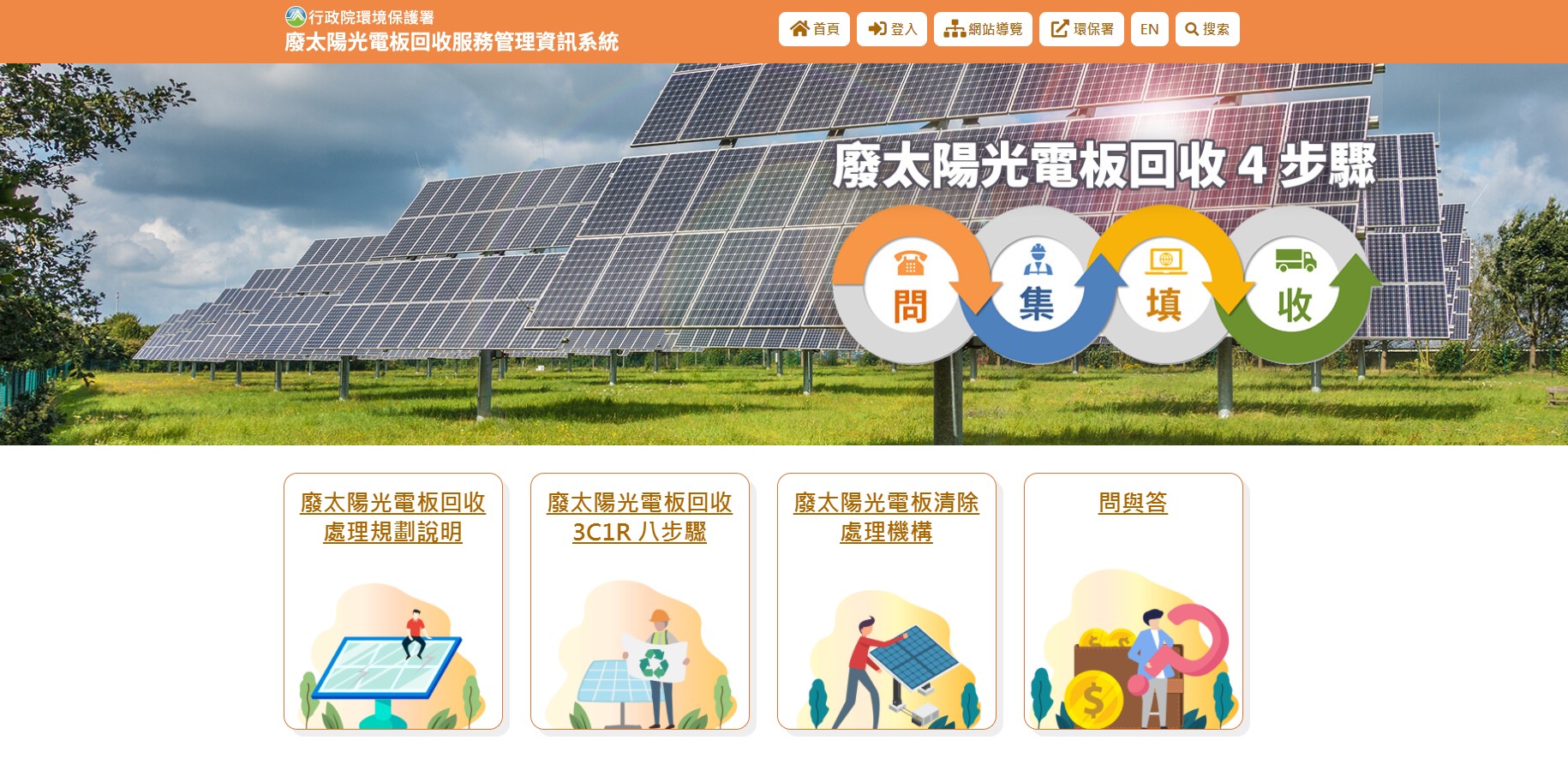 環保局提到,為建構完整廢棄太陽光電板回收清除處理體系,行政院環保署於108年以專案計畫方式委託社團法人台灣太陽光電產業協會建置「廢太陽光電板回收服務管理資訊系統( https://pvis.epa.gov.tw/pvis/ )」,協助發電業者回收廢太陽光電板,並積極輔導清除、處理機構於廢棄物清除處理許可證中增設「裝置使用後廢棄之太陽能光電板(D-2528)」廢棄物代碼,提升廢太陽光電板的清除處理管道。