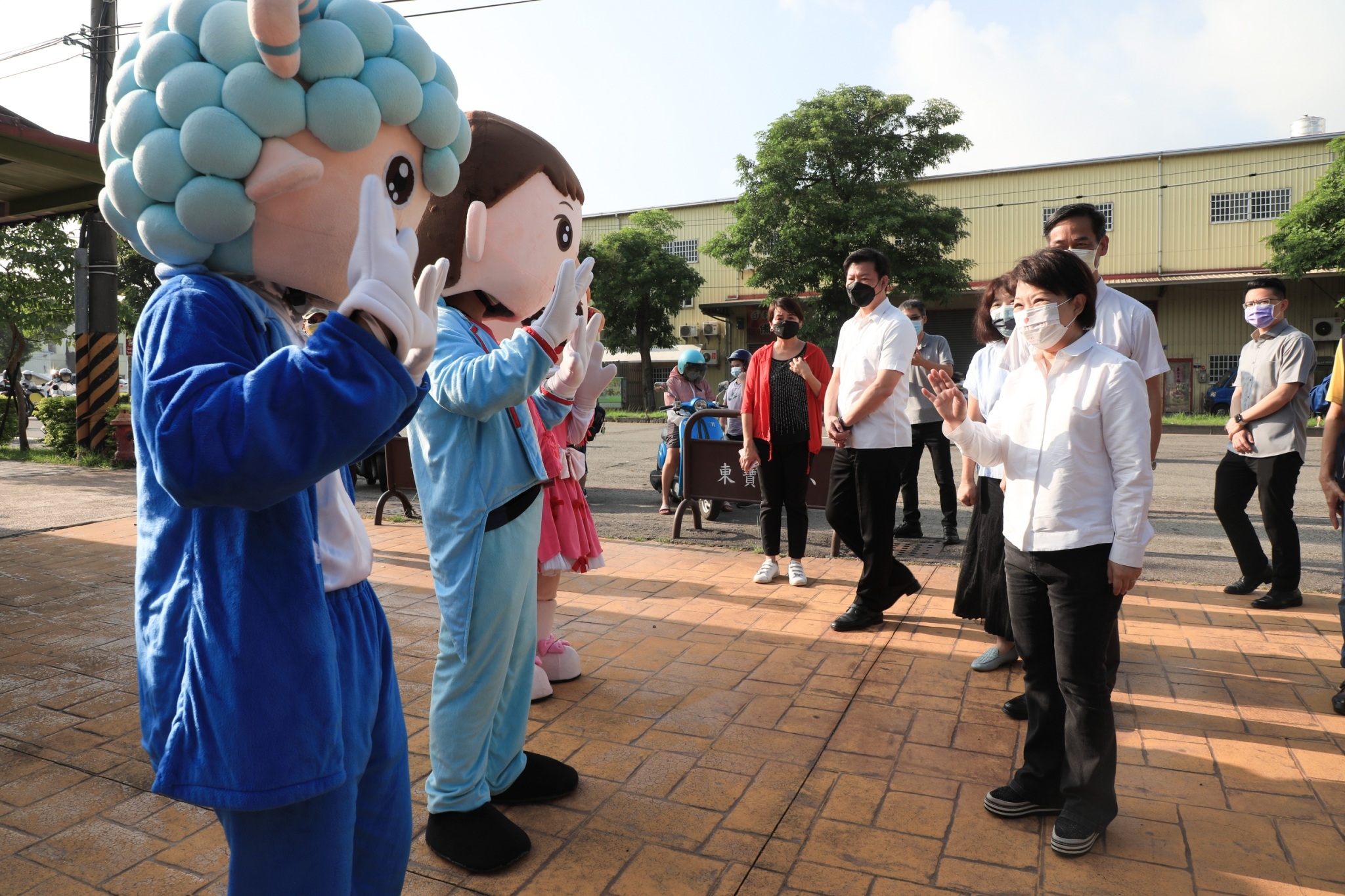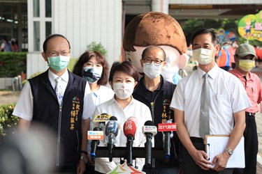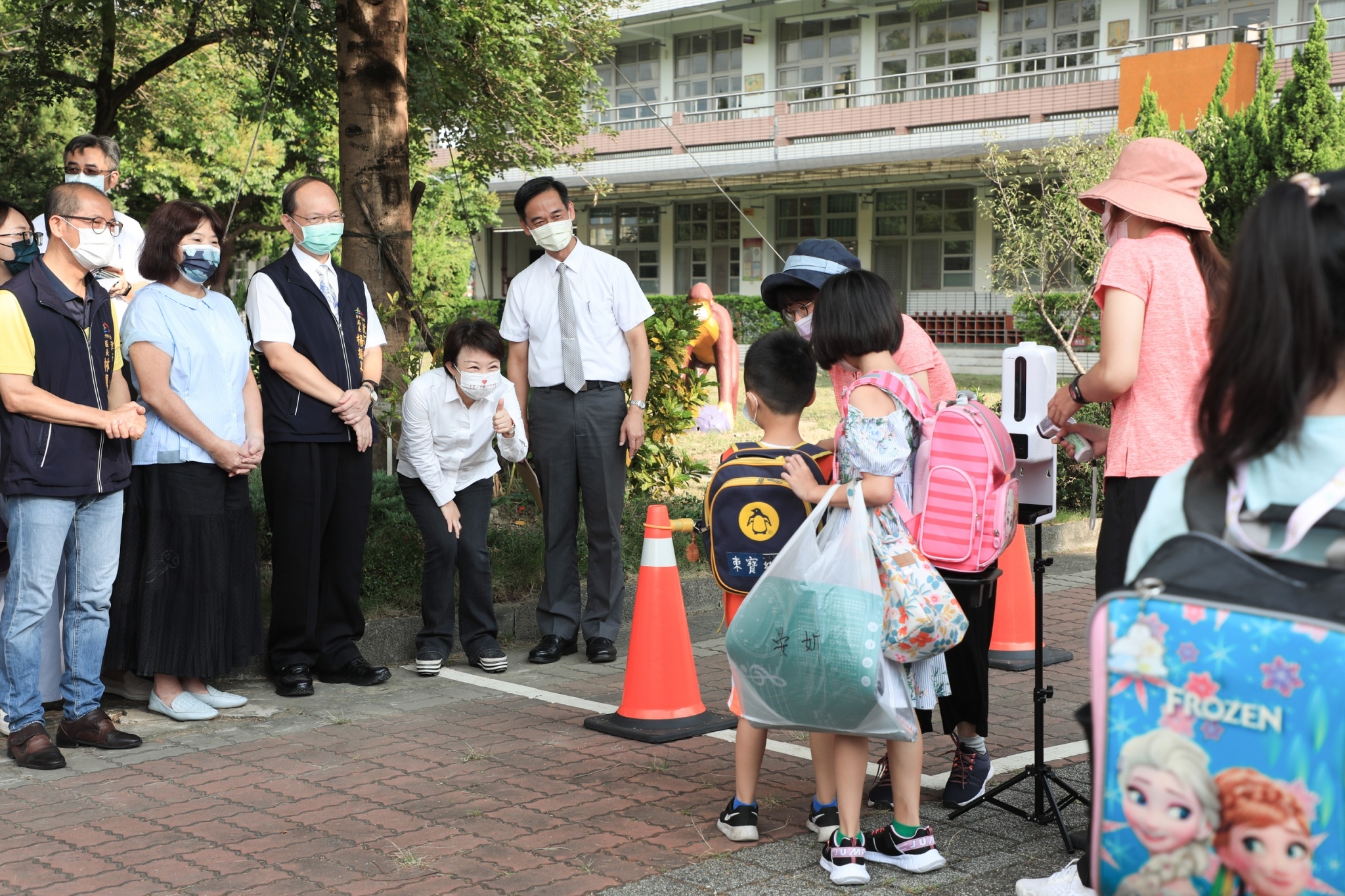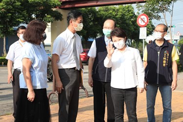 盧市長今早在教育局長楊振昇陪同下前往東寶國小,盧市長配合防疫規定於保持社交距離下,站在校門口迎接學童返校,她彎下腰向學童輕聲道早安,看到學童乖巧配合量額溫、噴酒精等防疫措施,更豎起大拇指給予孩童鼓勵。