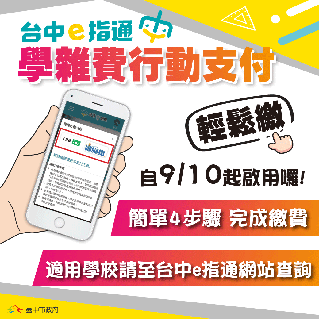 開學季又再為繳交學雜費手續煩惱嗎?「台中e指通」讓你一指完成繳費動作,輕鬆省時又方便!為提供民眾一機在手即可享有整合式市政服務及專屬個人化訊息,台中市政府於今年3月推出「台中e指通」數位市民平台,並逐步擴充數位化服務內容,今(10)日起開通「學雜費行動支付」,讓家長免去瑣碎的繳費實體程序。其它服務內容,如地方稅開徵、生活繳費介接等將於年底陸續上線,提供民眾更貼心、更有效率的服務品質!