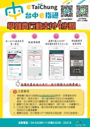 資訊中心表示,「台中e指通」-「學雜費行動支付」於9月10日上線,只要繳費單有超商三段式條碼(首先開放學校學費,家長會、員生消費合作社開立之費用預計下一階段納入),家長們透過簡單的步驟即可輕鬆繳費!可用支付工具包括LINE Pay Money及嗶嗶繳,目前適用學校共計106所,後續將持續增加校所納入「學雜費行動支付」行列裡。適用學校清單可至「台中e指通」網站( https://tcpass.taichung.gov.tw )查詢。另也提醒民眾,已完成行動支付繳費後,請勿再持單至便利商店等代收機構或其他方式重複繳費。