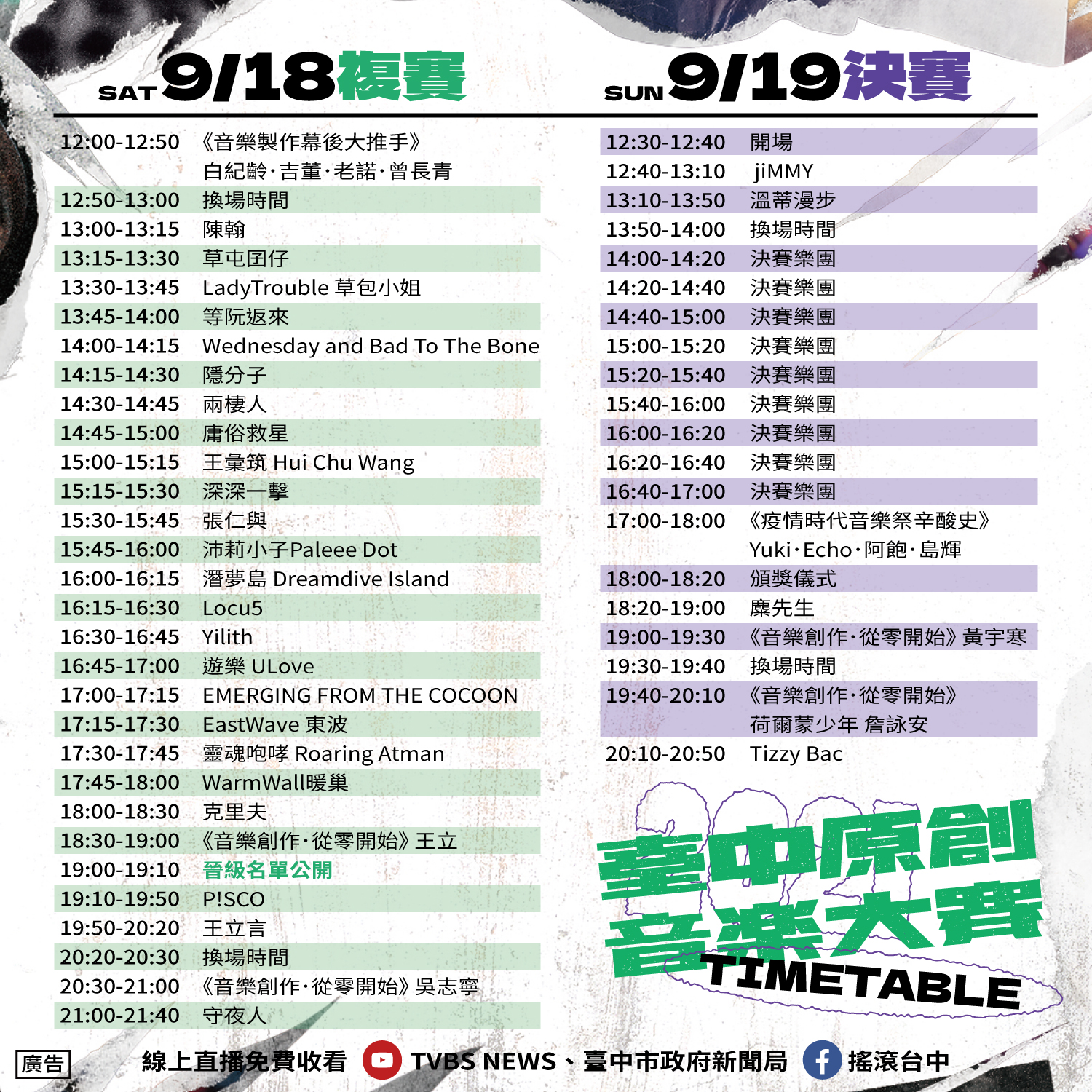 今(18)、明(19)兩日活動,可至搖滾台中粉絲專頁(https://www.facebook.com/RockInTaichungMusicFestival)、台中市政府新聞局YouTube(https://www.youtube.com/watch?v=zbPWuoa0Ro0)、TVBS NEWS YouTube頻道線上收看,請喜愛的民眾密切鎖定。(9/18*17)*新聞局