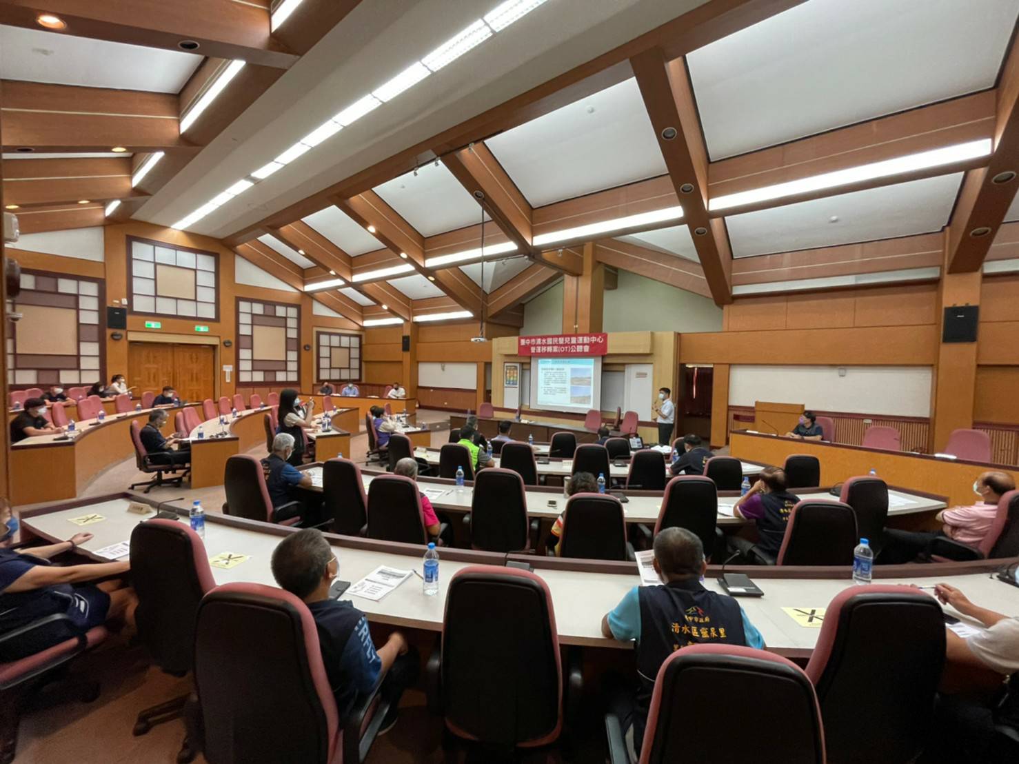 公聽會依據防疫規定舉行,現場落實防疫措施,台中市議會副議長顏莉敏、市議員王立任、陳廷秀、清水區體育會理事長陳財富、清水區多位里長、各運動中心執行長等人皆出席,台中市議會議長張清照、市議員楊典忠則派代表與會。(9/18*15)*運動局