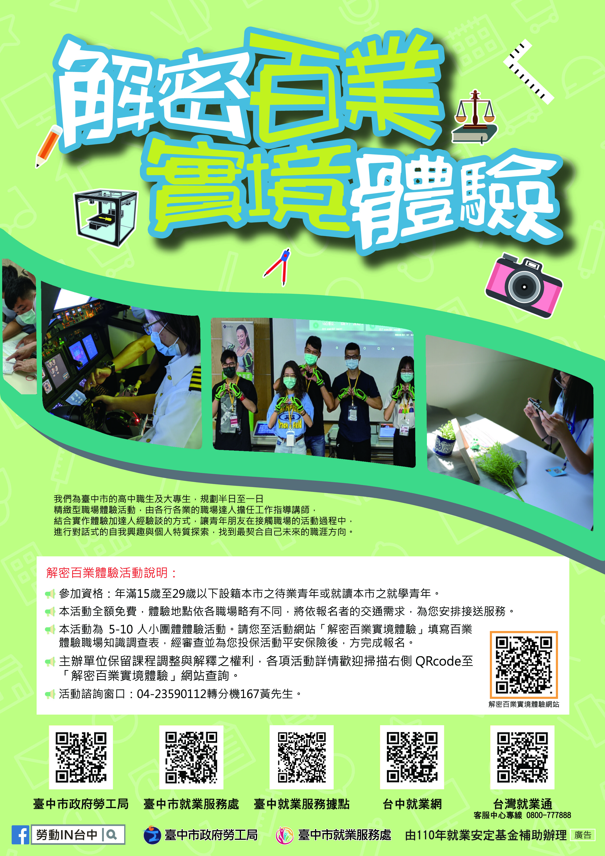 就服處表示,「解密百業 實境體驗」活動全程免費,現正開放報名中,並投保活動平安險,報名網址為https://sites.google.com/view/taichung-cdc/ ,報名專線04-23590112分機167,或電洽1999市民一碼通,或撥打市府總機04-22289111分機36100。(9/24*15)*勞工局