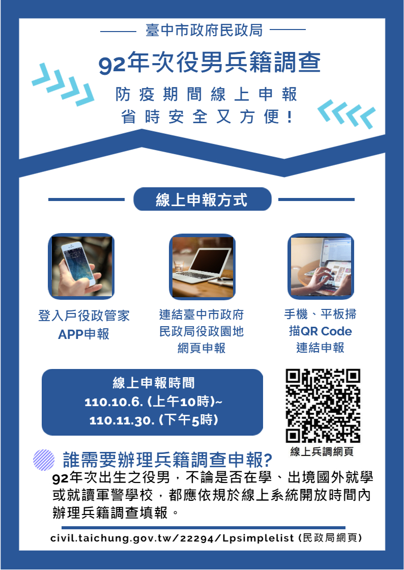 民政局提醒,92年次役男辦理兵籍調查時,多加利用線上系統進行申報,役男透過下列任一連結頁面即可進行申報,內政部役政署「110年兵籍調查線上申報」系統(https://reurl.cc/ox06XV )、台中市政府民政局首頁「役政園地-兵籍調查-兵籍調查線上申報系統」(https://reurl.cc/xEl24E )查詢,或是登入「戶役政管家APP」申報。 (10/7*8)*民政局