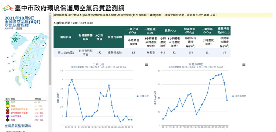 依環保署監測資料及預報資料,今(9)日環境風場為偏東風,竹苗以南地區位於背風側,清晨及夜間污染物稍易累積,白天起可逐漸改善,午後受光化作用影響,臭氧濃度易上升,指標污染物為「臭氧八小時」;台中市政府環保局今早發現部分空品監測結果較預期偏差,且指標污染物為「細懸浮微粒」,隨即於7時許通知前30大固定污染源配合執行降載,並通知相關單位,啟動應變措施。