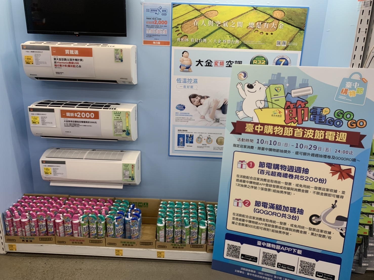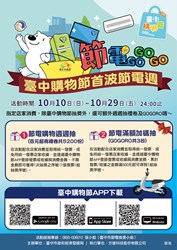 為鼓勵民眾購買節電及節能商品,共同投入綠能好生活,台中市政府經濟發展局特別於第3屆台中購物節中增加節電週活動,號召台中市山海屯超過270家販售節能家電、節能商品的店家加入優惠店家,民眾只要在指定優惠店家消費並登錄發票,除有機會抽中台中購物節好禮外,還可加碼抽超商禮卷及電動機車GOGORO,期盼藉此鼓勵民眾汰換老舊耗能電器或產品,帶動市民節電意識。