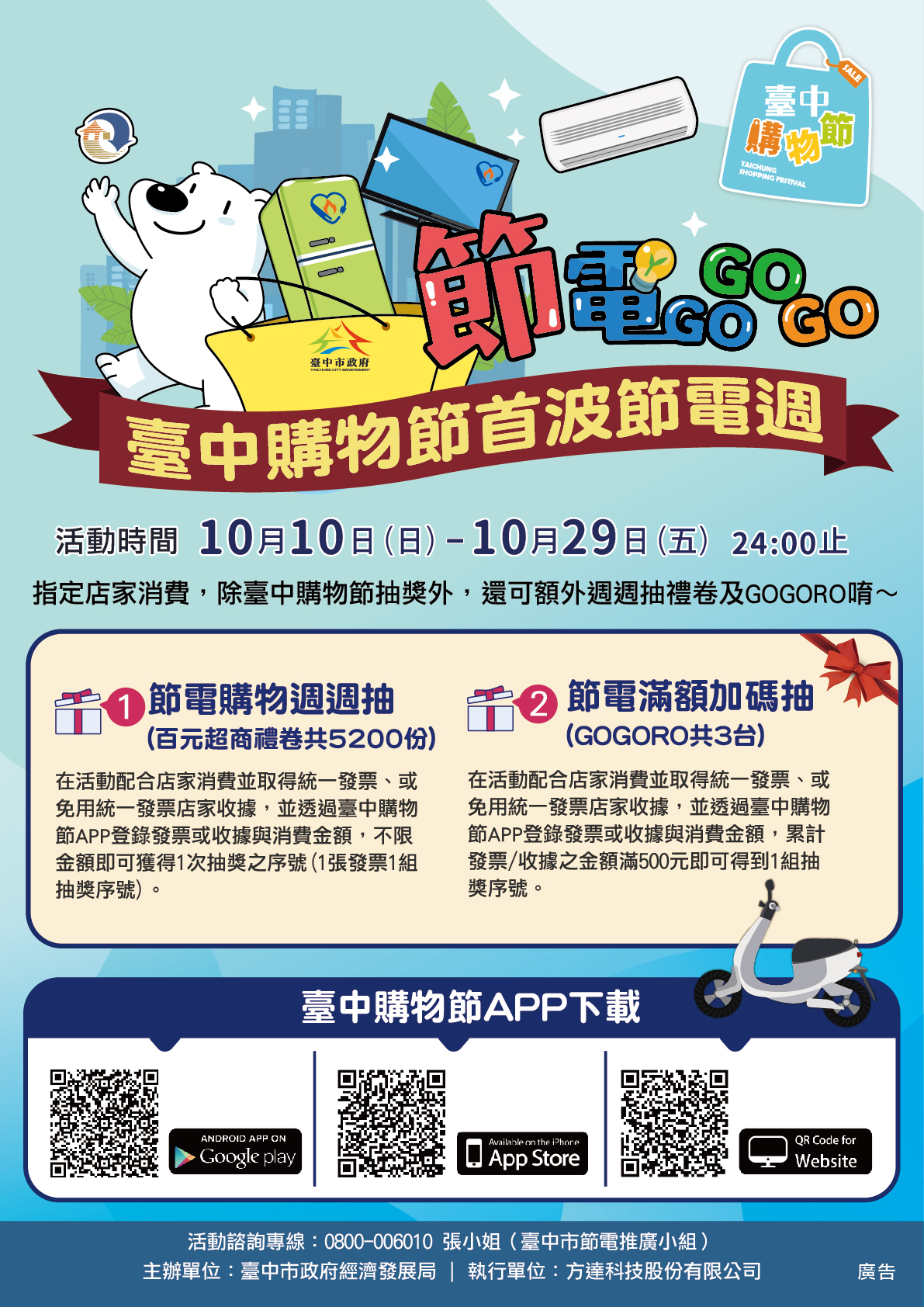 張局長進一步說明,民眾只要於節電週活動期間(10月10日至29日),至有販售節能家電、節能商品的指定優惠店家消費,並下載台中購物節APP登錄發票即可消費累積3倍送,還能參加台中購物節抽現金及千萬好宅等好禮抽獎,並享有加碼抽5,200份百元超商禮卷及3台電動機車GOGORO的機會,活動期間民眾消費滿額獲得抽獎序號採持續累計,該週未抽中還可繼續累計至下週抽獎,要讓民眾週週好禮「獎」不完。