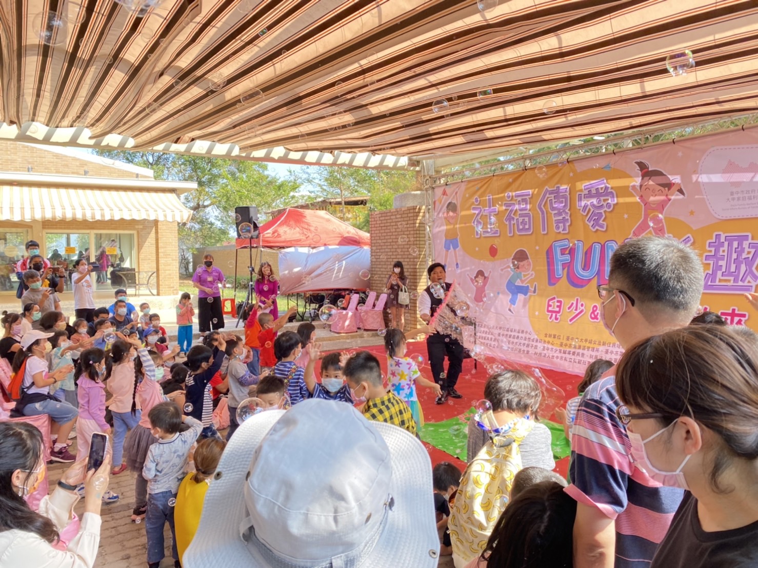 台中市政府社會局大甲家庭福利服務中心,今(31)日在大甲鐵砧山遊客中心正後方舉辦「女力逗陣來~社福傳愛FUN童趣」活動,結合轄區內相關社會福利單位,宣導社會安全網、多元文化、性別平等、兒少及身障福利、長期照顧等福利服務,現場還有新住民舞團、性平劇團、小丑魔術秀及夢幻泡泡秀等表演,另設計親子體驗活動,不少民眾扶老攜幼同樂、熱鬧非凡。