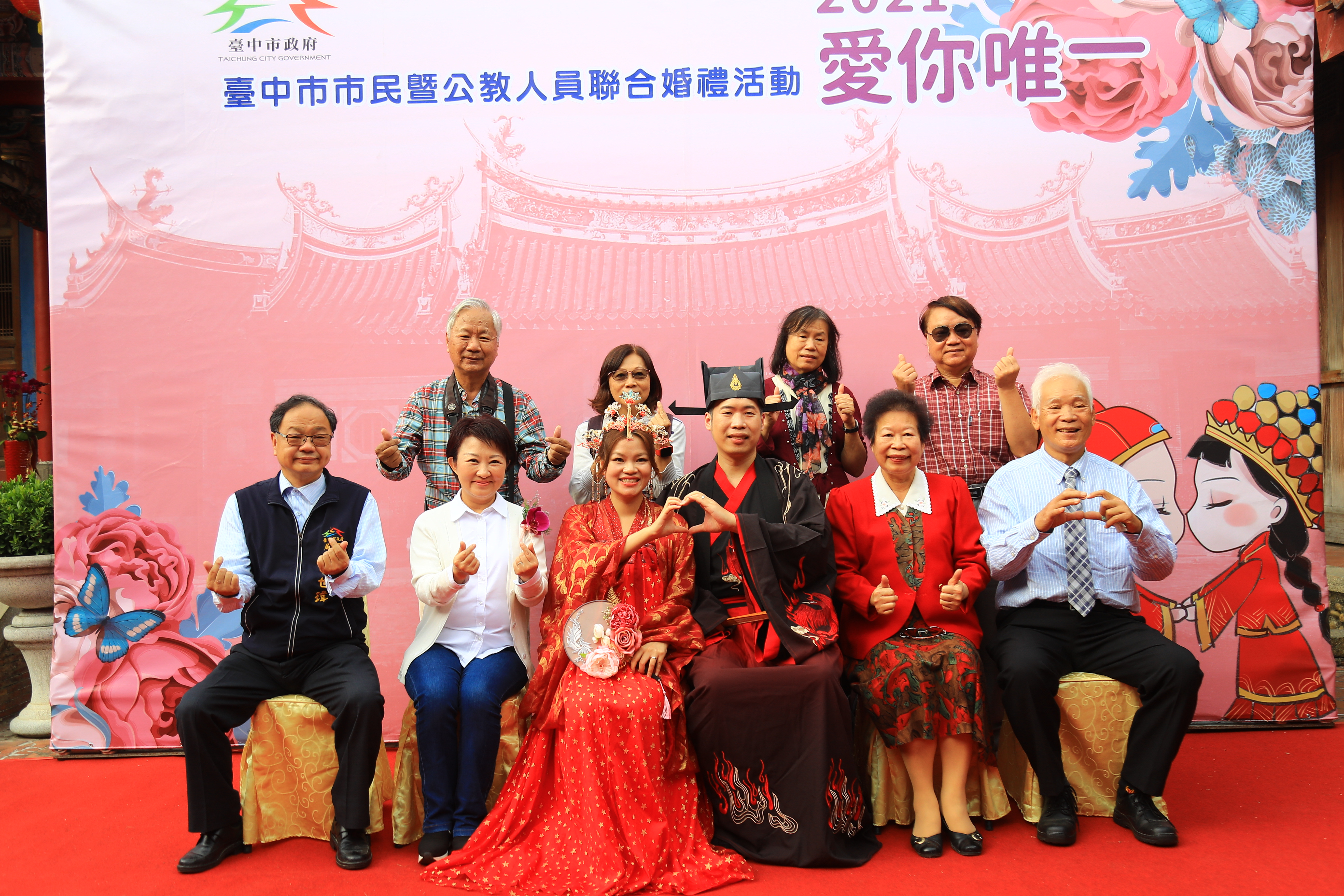 盧市長也感謝民政局同仁,因為疫情籌辦婚禮非常不容易,目前疫情趨緩才能順利舉辦,地點選在市定古蹟磺溪書院,也是台中市民票選的夢幻結婚景點第一名,並結合所在地區大肚,祝福每對新人「大肚成功」,早生貴子、幸福甜蜜,未來路上相遇,也希望跟她打聲招呼說聲「市長是妳幫我證婚的!」