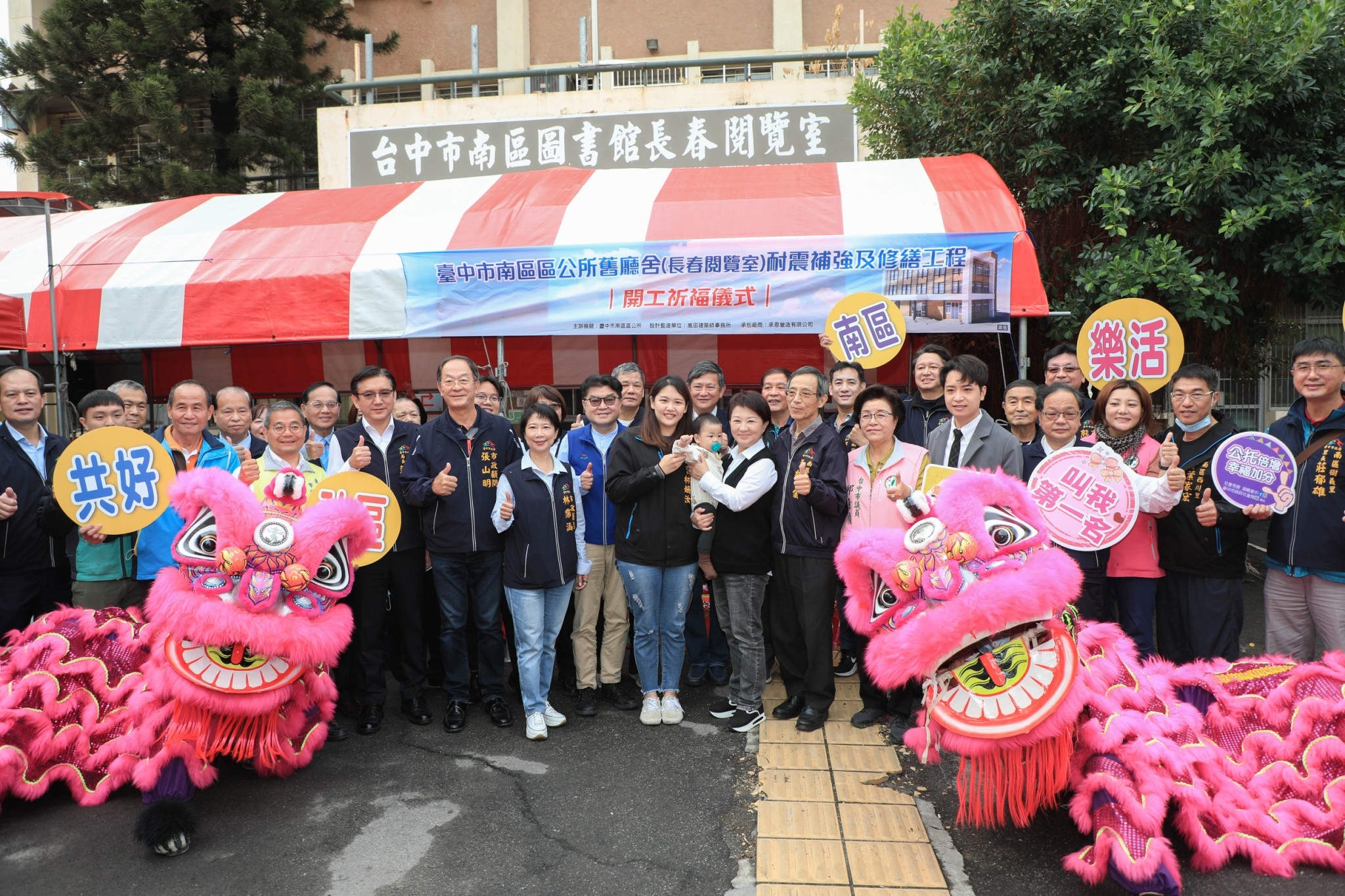 台中市南區公所舊廳舍(長春閱覽室)建築物屋齡已逾45年,經評定耐震能力不足建議補強,市府積極籌措經費,市長盧秀燕更動用第二預備金,共投入2,900萬元於今(22)日開工,1樓規劃作為公共托嬰中心使用,2、3樓則作為里民活動中心,盧市長主持祈福典禮表示,工程預計明年9月底完工,感謝各方努力促成,讓閒置空間活化再利用。