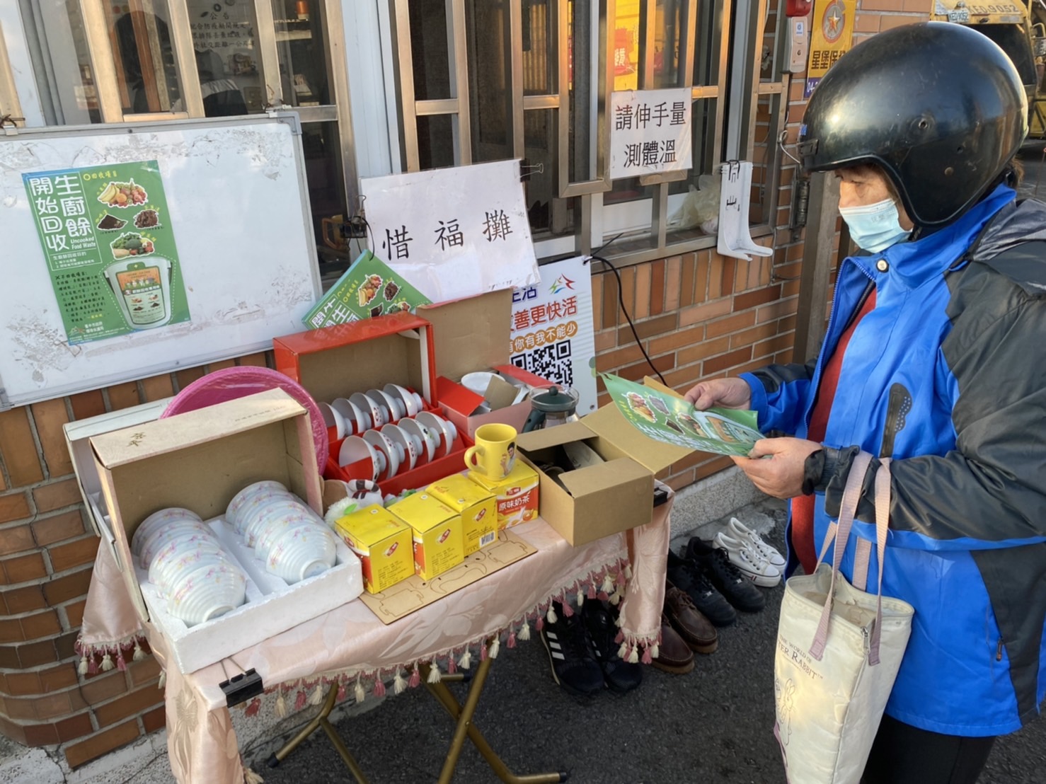倒垃圾也能逛攤位!除週三及週日之外,民眾只要下午5時來台中市大甲區清潔隊隊部門口「惜福攤」,就能免費挖寶,限量送完為止。大甲清潔隊推廣愛物惜物、資源回收再利用的觀念,以「寓教於垃(圾)」邀民眾做環保愛地球,從菜瓜布、手提包、杯碗、玩偶、鏡子,到未開封的鞋子都有擺出來,日前有一對小姐妹抱走皮卡丘、小柴犬布娃娃,開心與戰利品一起賣萌合照。