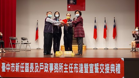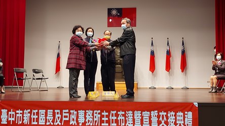 台中市政府今(14)日舉行「北區區長、北區戶政事務所、太平區戶政事務所暨豐原區戶政事務所主任布達暨宣誓交接典禮」,由民政局長吳世瑋代表市長盧秀燕主持及監誓,期勉新任區長及戶所主任帶領所屬團隊努力打拚,走入基層傾聽聲音,共創市政繁景。