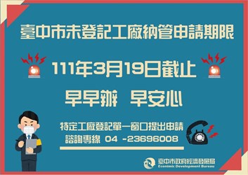 經發局強調,納管申請期限只到今年3月19日止,距今僅剩半個月,呼籲符合納管條件的未登記工廠業者把握機會,儘速透過現場送件、線上申辦( https://serv.gcis.nat.gov.tw/fsp/identity/Identity/init.do )或郵寄申辦方式向「台中市政府特定工廠登記單一窗口」(地址:台中市西區三民路一段158號8樓、諮詢專線04-23696008分機101、107)提出納管申請,切勿心存僥倖,以免屆期未申請而面臨停止供電、供水情事。(3/2*7)*經濟發展局