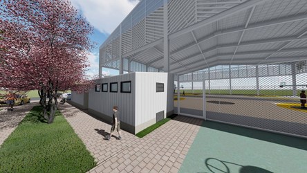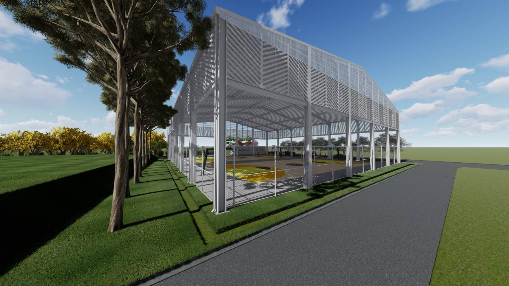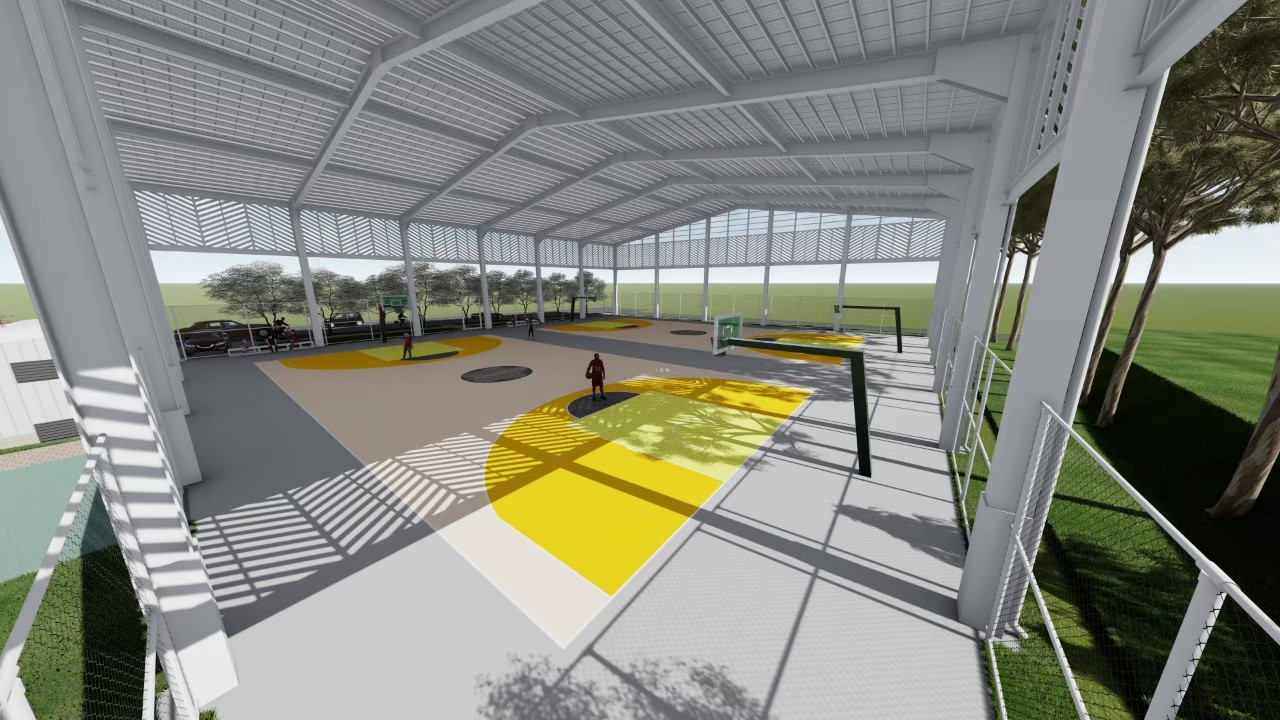 新社區長林淑惠表示,風雨運動場基地位於新社區復盛里,鄰近新社老人文康中心、農會、衛生所及軍公教警消等各機關學校,規劃興建地上一層建築物,包括兩個全場籃球場、戶外公有廁所、共融遊憩設施、周邊植栽綠美化等完善休憩空間,頂棚並建置太陽能光電設施,完工後預估年發電量12萬5,000度、發電收入61萬3,836元,區公所年租金收入6萬1,384元,成為兼顧優質運動空間及減碳抗空汙功能的客庄禾埕新場域。