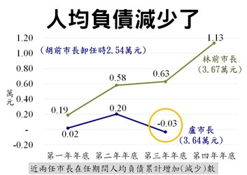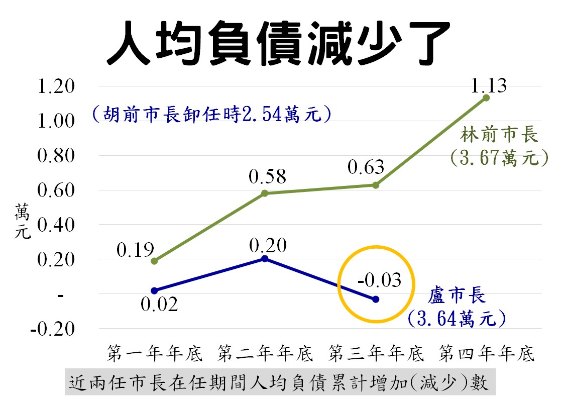 市長盧秀燕上任以來,以「建設更多、舉債變少」為目標,積極透過預算編列、賒借控管及審慎執行預算,讓台中財政狀況日趨好轉。市府財政局今(15)日市議會專案報告時指出,截至去年底,市民每人平均負債已由107年底的3萬6,721元減少至3萬6,403元,減少318元,舉債金額也由104年至107年平均每年216億元,急遽下降至111年96億元,是縣市合併以來最少的賒借預算,中止債務急遽惡化現象。