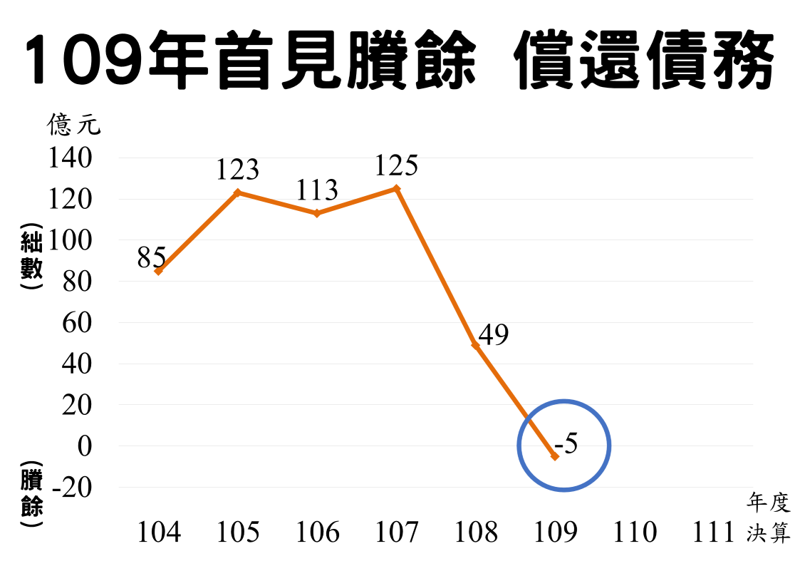 財政局指出,透過市府各機關通力合作、落實開源節流,109年度歲入歲出賸餘近5億元,是台中市升格直轄市10年以來首見賸餘,且尚可舉債額度由107年底接任時的88億元增加為111年的372億元;此外,台中公共債務未償餘額實際數已由107年的約1,030億元降低至約1,024 億元,逐漸厚實台中財政體質。