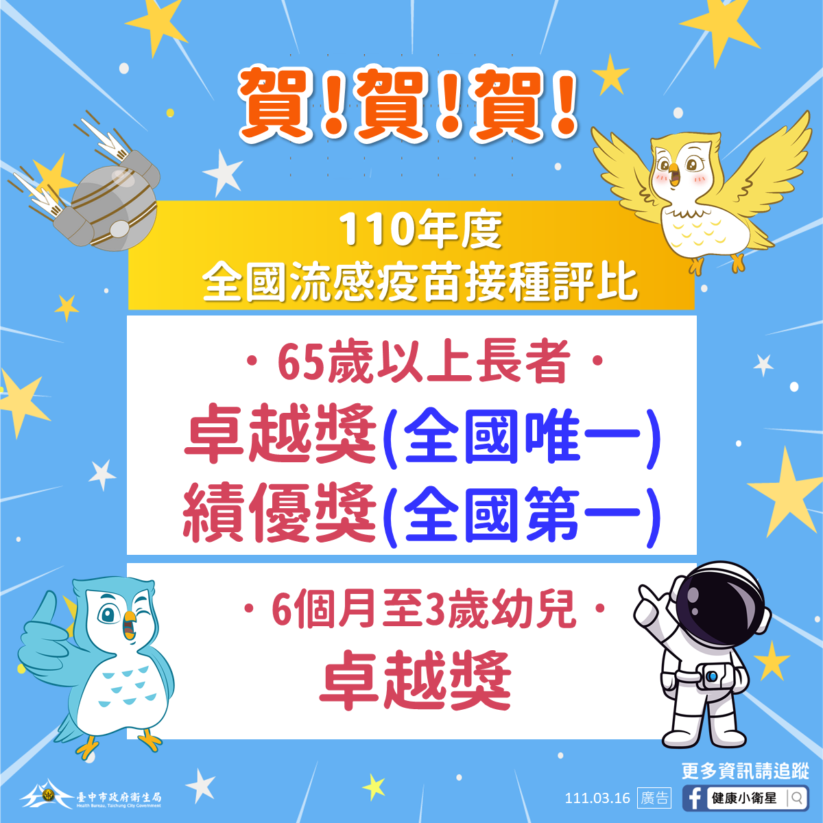 衛生福利部疾病管制署近日公布全國110年流感疫苗接種計畫獎勵作業成績,台中市因採購「65歲以上長者」流感疫苗量使用率全國最高,榮獲績優獎項,更是唯一將長者疫苗採購量全數使用完畢的縣市,再榮獲卓越獎殊榮,另在「6個月至3歲未曾接種幼兒」項目也全數完成採購疫苗的接種,榮獲卓越獎肯定。