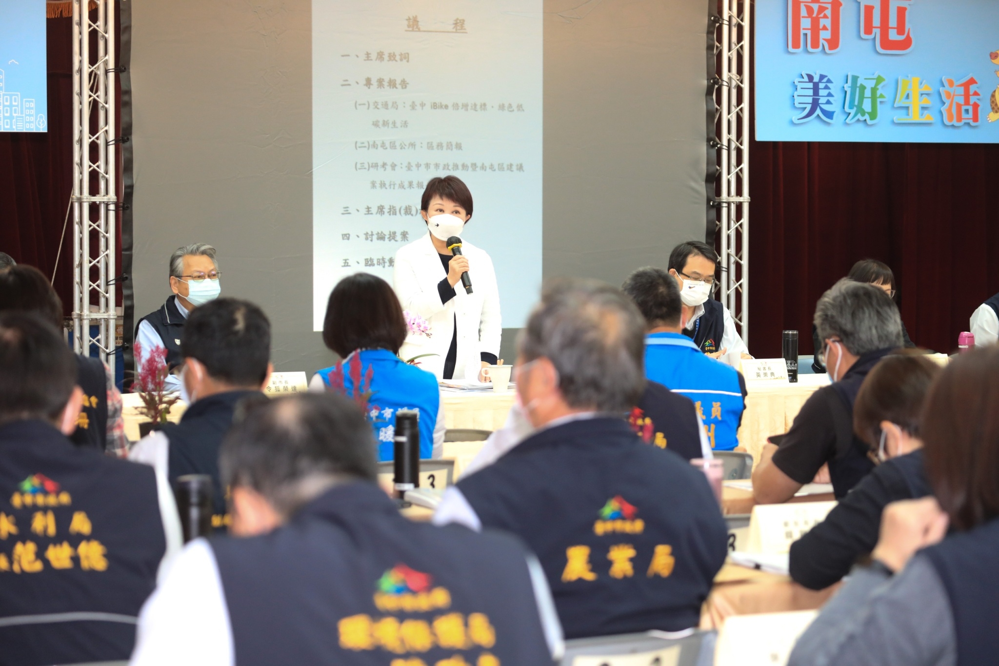 台中市政府今(29)日於南屯區公所召開行動市政會議,市長盧秀燕主持表示,近期本土確診案例暴增,感謝市民配合市府防疫政策,台中疫情相對平穩,因此市府繼續到各區召開市政會議,與地方面對面溝通,讓施政更接地氣;為繼續守住台中疫情,她再重申4個呼籲,提醒民眾外出需佩帶口罩、避免跨縣市移動、祭祖減少掃墓人數及儘速接種第三劑新冠疫苗,保護自己與他人健康。