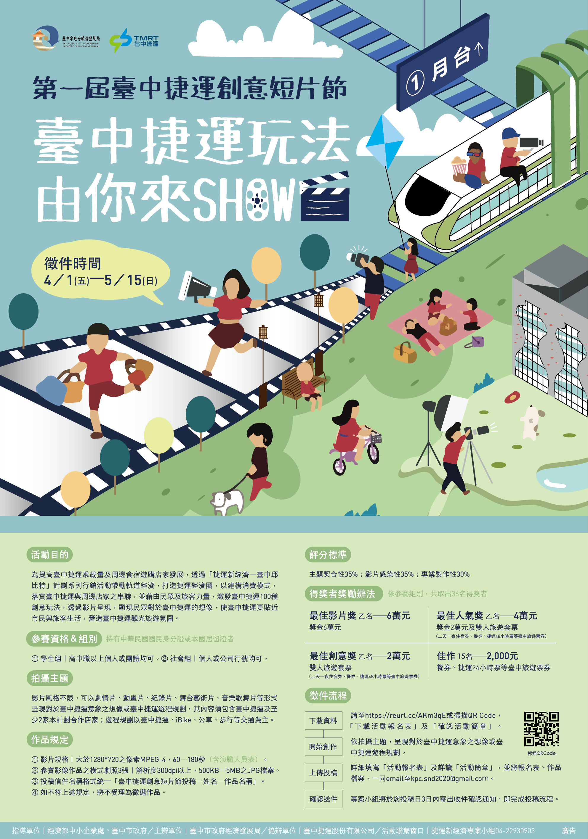 台中捷運綠線即將於今年4月迎來通車一週年,為打造台中捷運經濟生活圈,台中市政府經發局攜手台中捷運公司,首發「台中捷運創意短片節─台中捷運玩法,由你來SHOW」,希望藉由民眾及旅客力量,運用影片呈現捷運與這座城市的想像,激發台中捷運100種創意玩法。