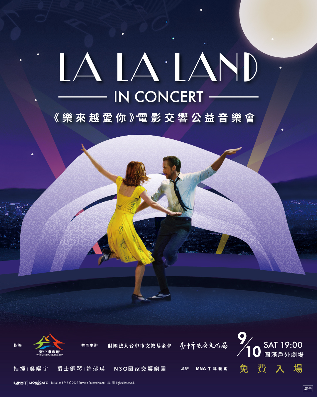 中秋團圓夜,台中市政府文化局邀請市民一起賞樂共舞!《樂來越愛你》電影交響公益音樂會,9月10日晚上7時將在圓滿戶外劇場舉行,邀請NSO國家交響樂團、TPO Jazz Band踢霹歐爵士大樂團、爵士鋼琴女神許郁瑛,重現電影中的爵士樂曲,並搭配戶外大螢幕同步播映電影全片,打造如好萊塢露天劇場般的音樂盛會,現場免費開放民眾入場欣賞,共度浪漫中秋!