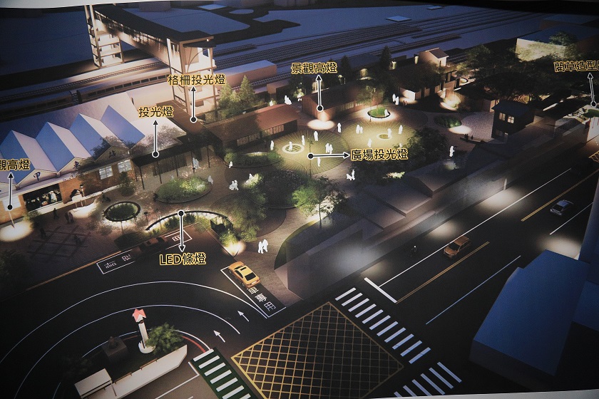 「燈光美、氣氛佳,讓火車站漂亮起來!」盧市長指出,該工程編列4,100萬元預算,其中動用市長第二預備金3,500萬元,預計明年1月完工,保留老樹、加強植栽,同時裝設照明設備美化環境,民眾也可舉辦市集、里民活動等,感謝在地議員及里長支持,及台鐵局提供場域讓市府辦理活化工程。