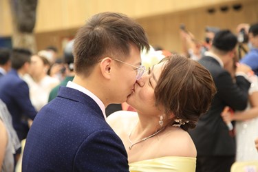 盧市長隨後帶領所有新人宣讀愛戀宣言,並向父母一鞠躬致親恩。新人們除了交換戒指信物,並進行雙方互吻儀式。盧市長還打趣請新人認真執行九秒鐘長長久久的深吻,場面逗趣又溫馨。