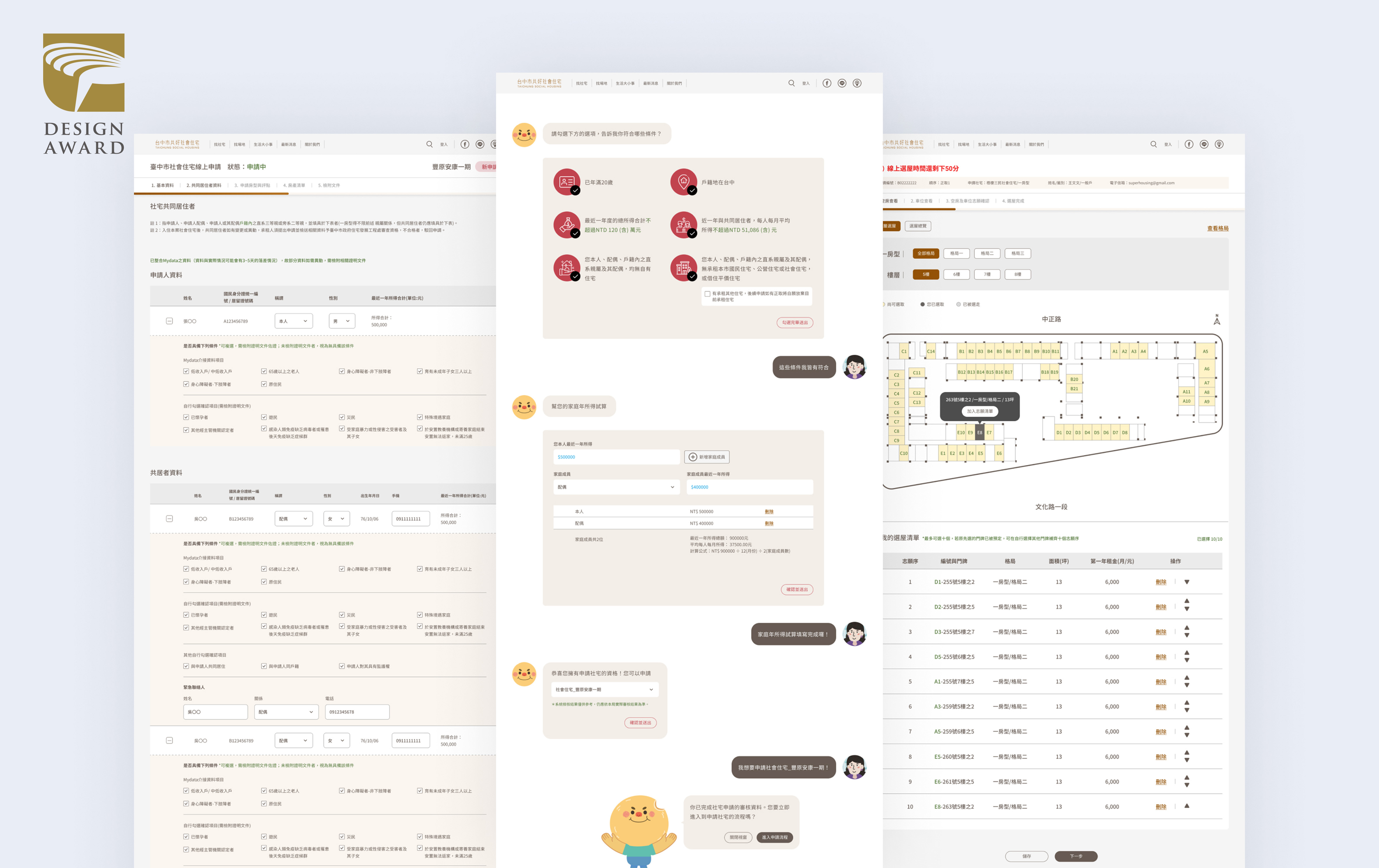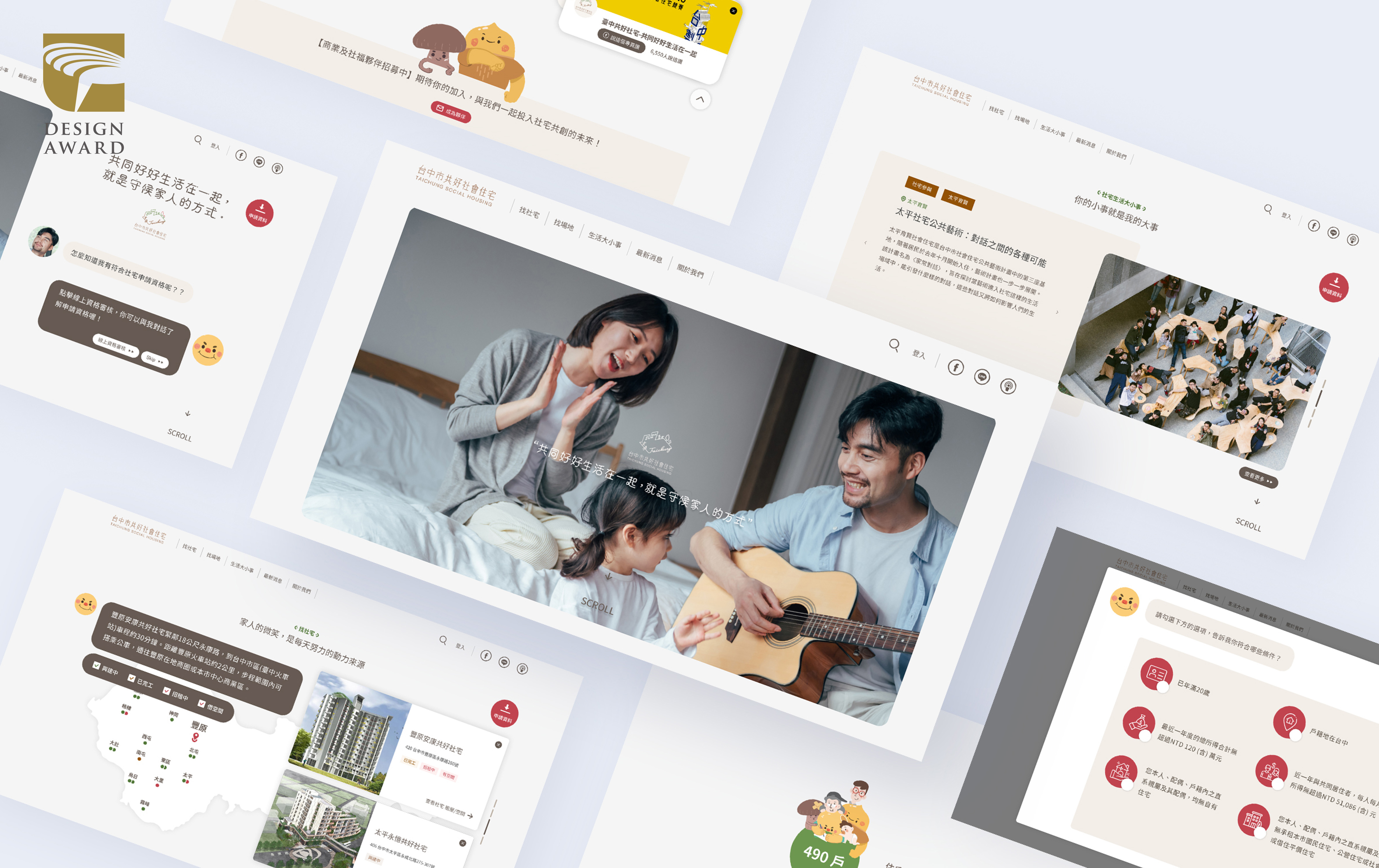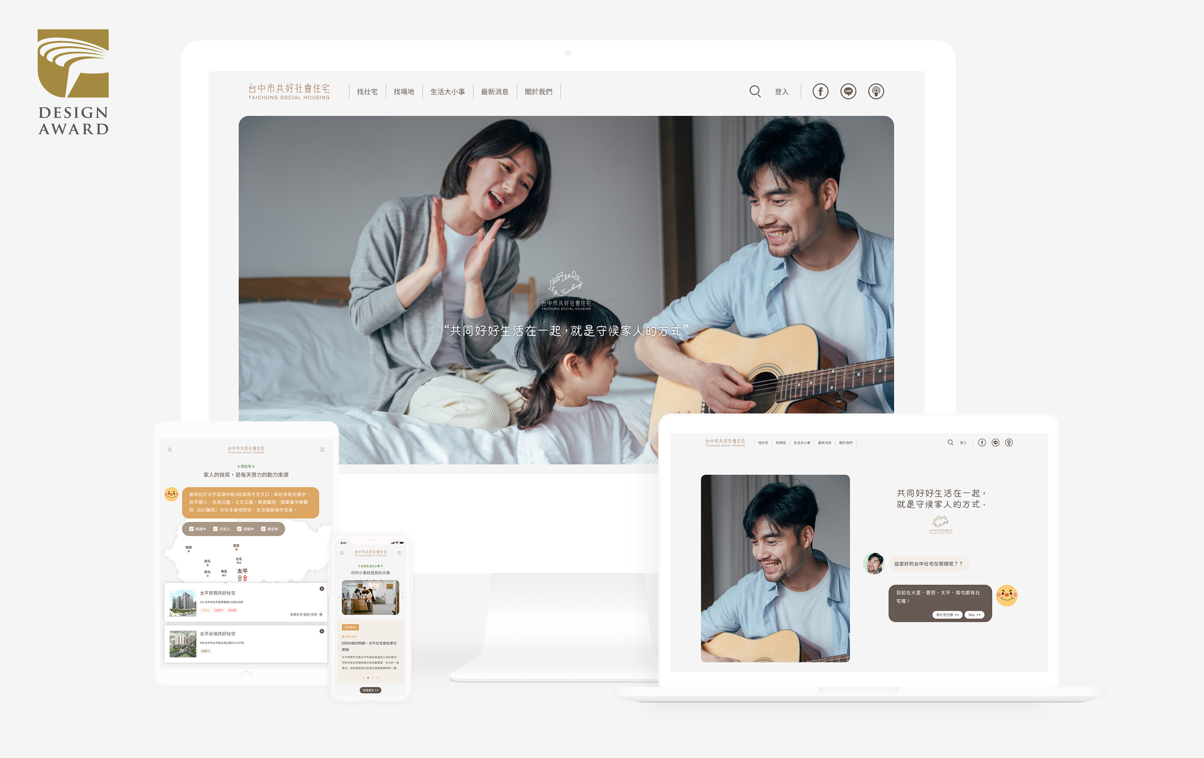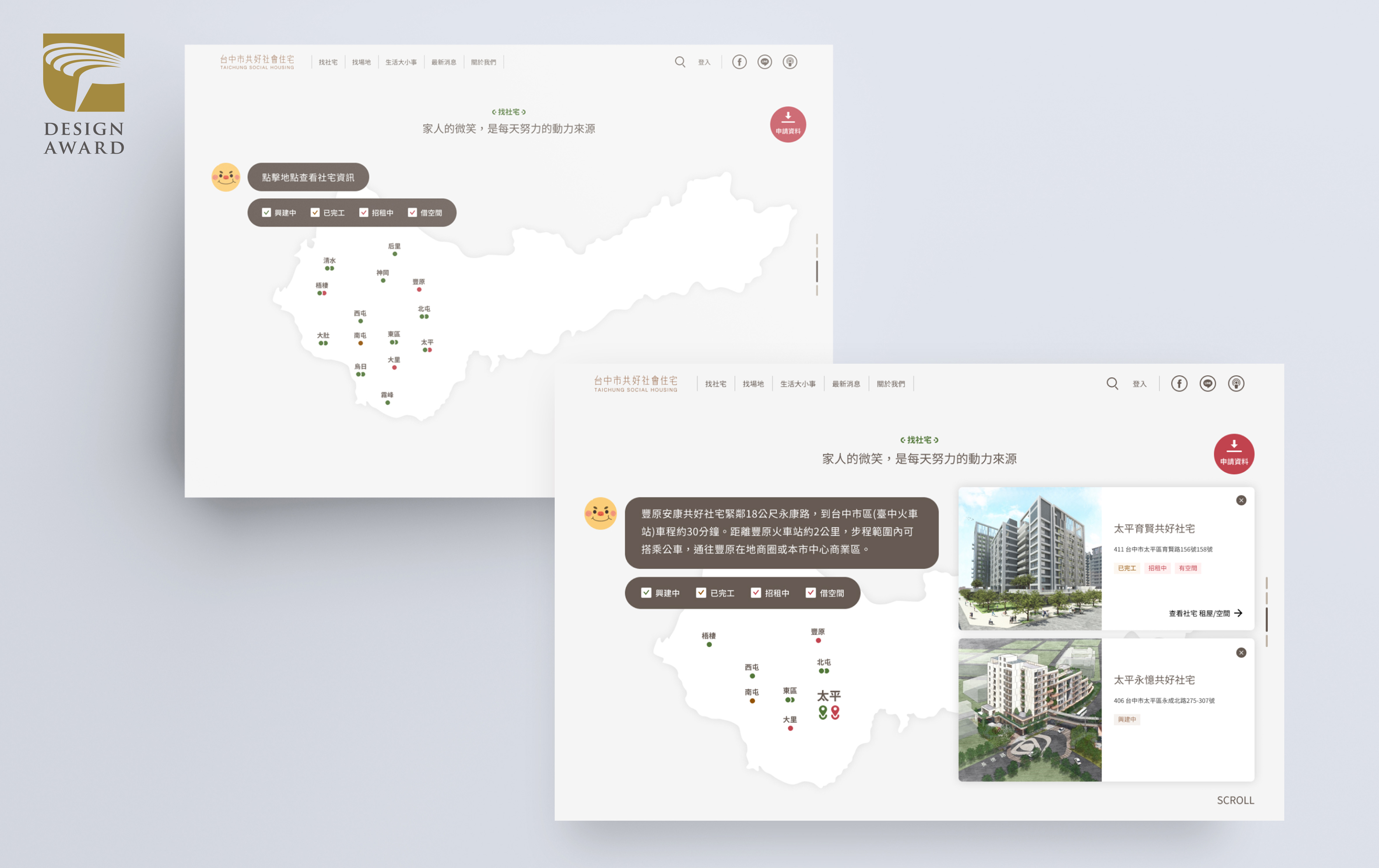 台中好宅17租網站以「台中社宅的數位服務塑造」為設計主題,參與2022金點設計獎-服務設計類別,得獎名單於日前公布,台中社會住宅一站式入口網作品脫穎而出,拿下服務設計類「金點設計獎標章」,並取得晉級資格。將於9月21、22日角逐象徵最高榮耀的「年度最佳設計獎」。