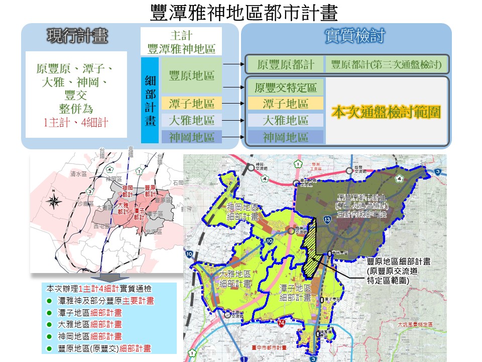都發局進一步指出,目前已完成潭雅神地區都市計畫整併作業,於108年11月14日公告發布實施「台中市豐潭雅神地區都市計畫主要計畫」及4處細部計畫,並接續啟動豐原、潭子、大雅、神岡都市計畫主要計畫及細部計畫的實質檢討作業,前開通檢草案已於今年2月7日起公開展覽30天,正於台中市都市計畫委員會專案小組審議階段。