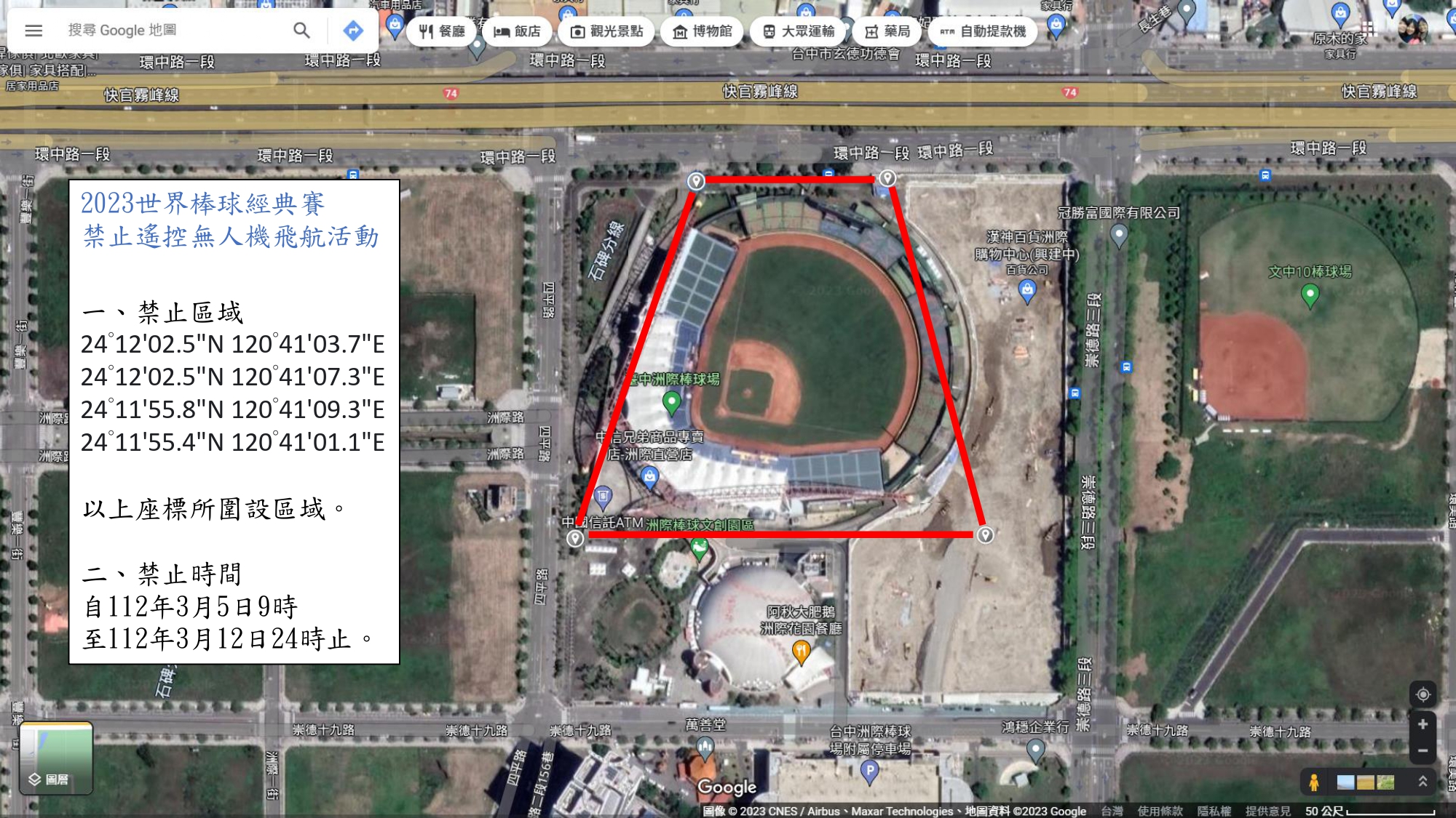 1.因應本市辦理2023世界棒球經典賽,因屬人群聚集之處,及為各項表演活動順利進行,新增公告距地表高度不逾四百呎之區域,禁止從事遙控無人機活動。