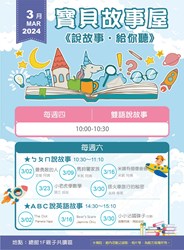 ㄅㄆㄇ說故事時間: 每週六上午 10:30-11:10 、單週六下午13:40-15:10 寶貝故事屋活動由總館故事志工,配合館方多元閱讀主題及節慶等活動,說演故事 3月02日上午(主講)宜瑩阿姨/最勇敢的人 3月09日上午(主講)米妮阿姨/馬鈴薯家族 3月16日上午(主講)米妮阿姨/米娜有個傻爸爸 3月23日上午(主講)頂立叔叔/小老虎學數學 3月30日上午(主講)永祥哥哥/搭火車旅行的秘密 ABC說英文故事 14:30-15:00 3月02日下午(主講) Pamela Ngai/The Dot 3月16日下午(主講)Jasmine Chiu/Bear's Scare 3月30日下午(主講)淑惠阿姨、得銘叔叔/小小沾醬碟子(日語) |