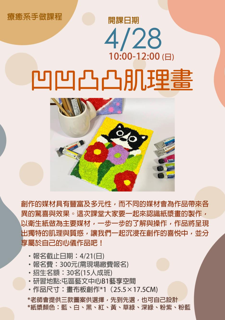 創作的媒材具有豐富及多元性,而不同的媒材會為作品帶來各異的驚喜與效果。這次課堂大家要一起來認識紙漿畫的製作,以衛生紙做為主要媒材,一步一步的了解與操作,作品將呈現出獨特的肌理與質感,讓我們一起沉浸在創作的喜悅中,並分享屬於自己的心儀作品吧!