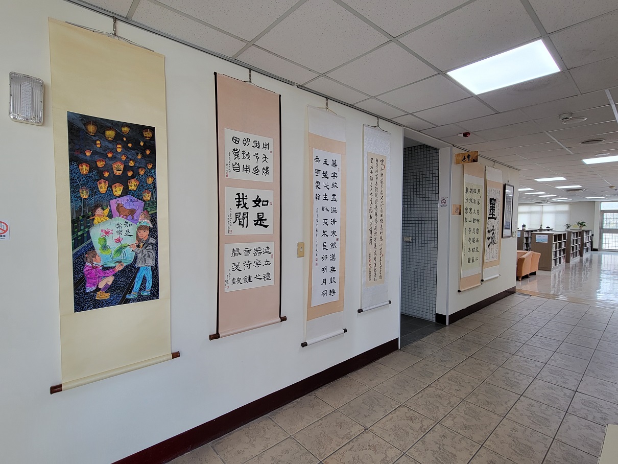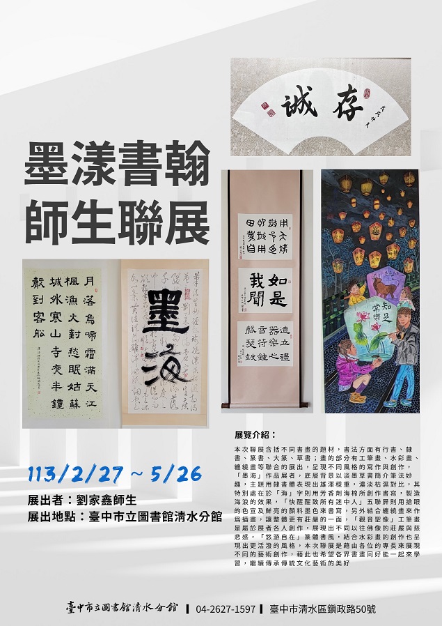 展覽介紹:本次聯展含括不同書畫的題材,書法方面有行書、隸書、篆書、大篆、草書;畫的部分有工筆畫、水彩畫、纏繞畫等聯合的展出,呈現不同風格的寫作與創作,「墨海」作品展者,底層背景以淡墨草書簡介筆法妙趣,主題用隸書體表現出雄渾穩重,濃淡枯濕對比,其特別處在於「海」字則用芳香劑海棉所創作書寫,製造海浪的效果,「快醒醒致所有迷中人」五聯屏則用搶眼的色宣及鮮亮的顏料墨色來書寫,另外結合纏繞畫來作為插畫,讓整體更有莊嚴的一面,「觀音聖像」工筆畫是屬於展者各人創作,展現出不同以往佛像的莊嚴與慈悲感,「悠游自在」篆體書風,結合水彩畫的創作也呈現出更活潑的風格,本次聯展是藉由各位的專長來展現不同的藝術創作,藉此也希望各界書畫同好能一起來學習,繼續傳承傳統文化藝術的美好