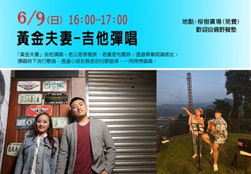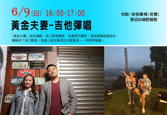 「黃金夫妻」吉他演唱,老公是泰雅族、老婆是布農族的,透過音樂認識彼此,他們以音樂作為媒介輕快彈奏,讓民眾沉浸式傾聽原住民母語,隨著旋律搖擺。