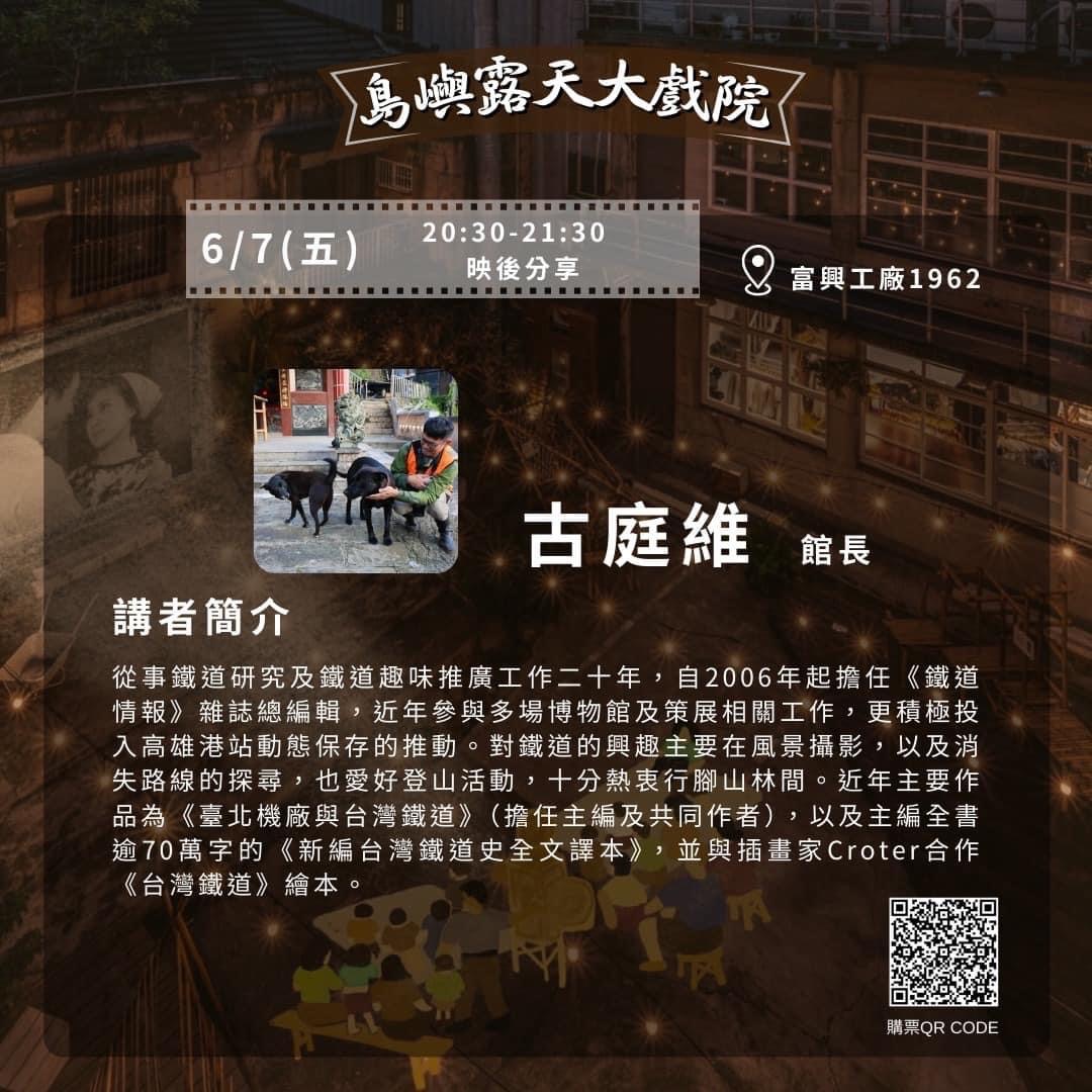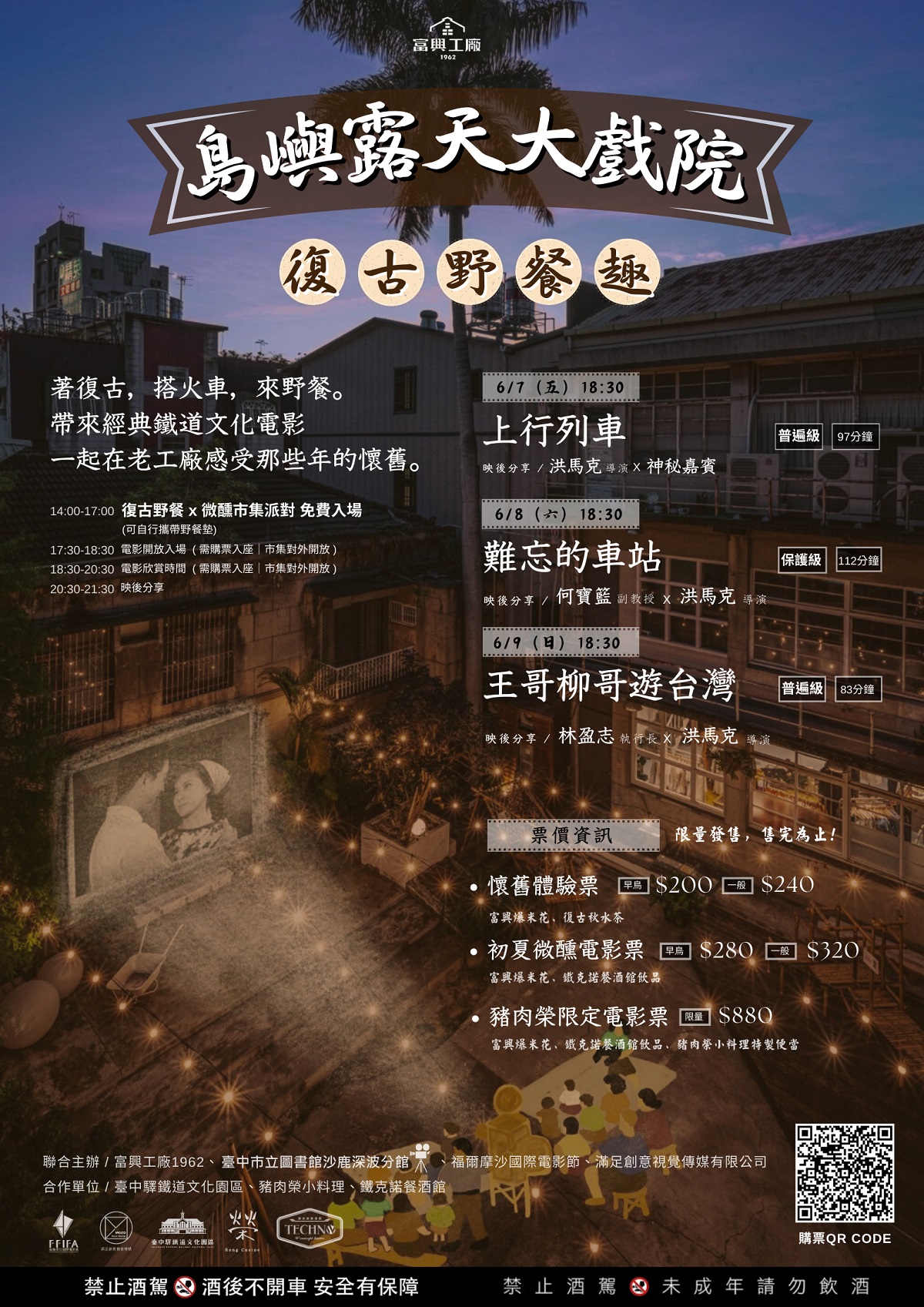 富興工廠1962為臺中市政府老屋活化案例之一,持續關注在地文史及文化。113年度更聚焦國際SDGs議題及文化,島嶼露天大戲院經111年度辦理,今年度更結合園區市集活動、野餐活動,讓看懷舊電影也是一件很潮的事。為推廣6月9日之鐵路節,特別挑選有關火車之懷舊電影:《上行列車》、《難忘的車站》、《王哥柳哥遊臺灣》,並邀請專業影評人及福爾摩沙國際電影節創辦人洪馬克導演擔任與談人作映後座談。