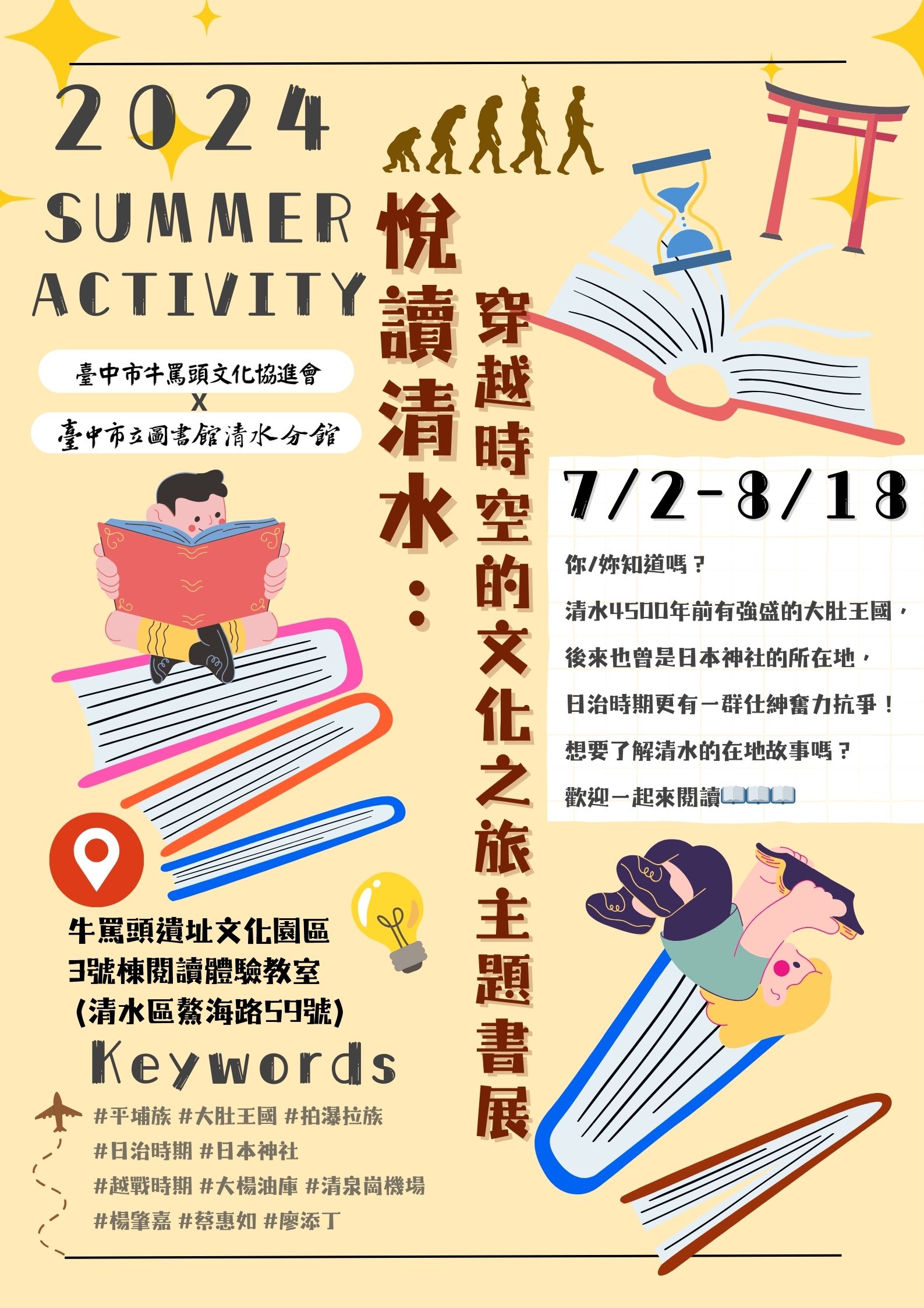 本次書展精選了清水地方歷史和文化書籍,涵蓋史前文化、歷史人物、文化遺產和當代文化。讓我們一起走進書籍的世界,穿越歷史的長河,感受文化的魅力,與拓展孩子們的文化知識觀。在這裡,每一個故事都是一段旅程,每一本書都是一扇窗戶,帶領您看見不一樣的清水文化!
