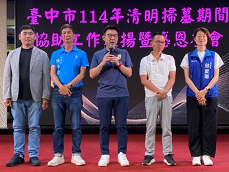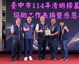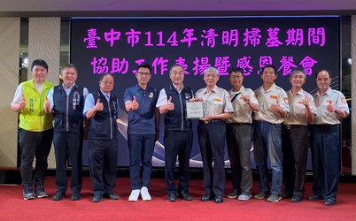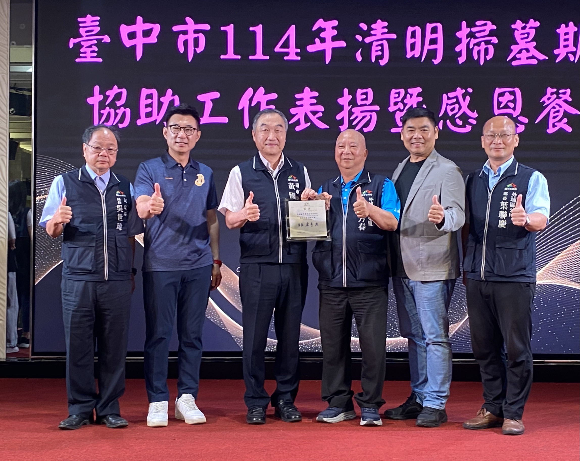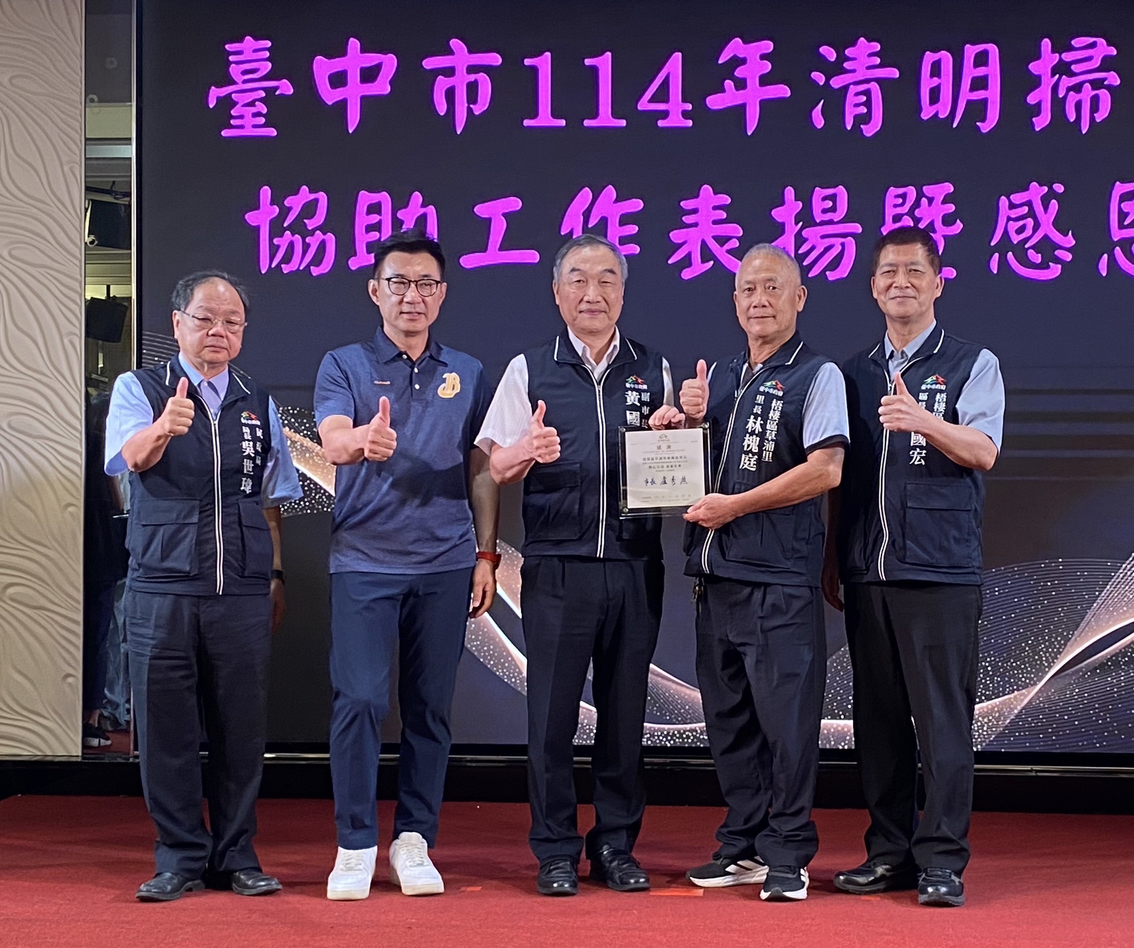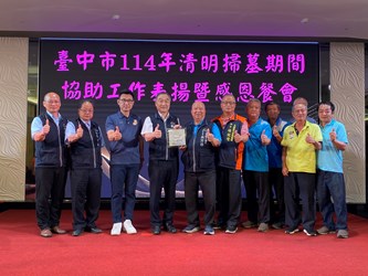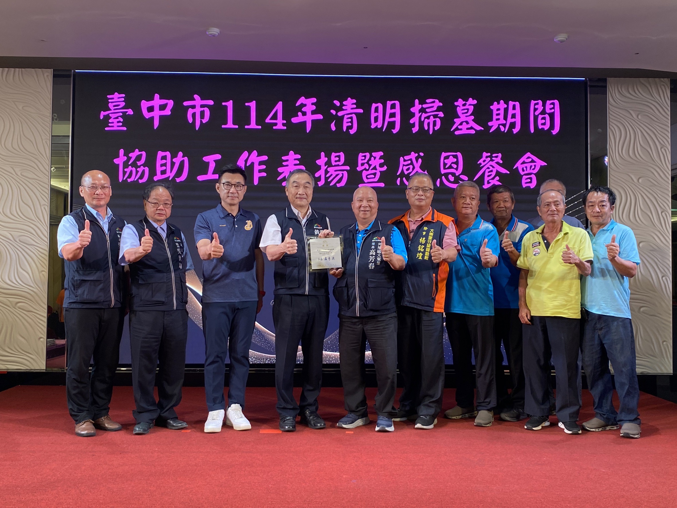 台中市政府近年預防清明公墓火警,近3年增加經費全面清運墓區割除後雜草,經統計,今年全市墓地延燒面積較前年驟降96%,成效顯著。市府昨(19)晚舉辦協助清明掃墓期間有功人員表揚活動,表揚神岡、潭子、大雅、豐原、后里、新社、石岡、東勢、外埔、清水、沙鹿、梧棲、大甲及大安等14區,共14位里長及34隊里守望相助隊,由副市長黃國榮代表市長盧秀燕出席頒發感謝獎牌,感謝投入公墓防火、交通疏導等工作,齊力守護市民安全。