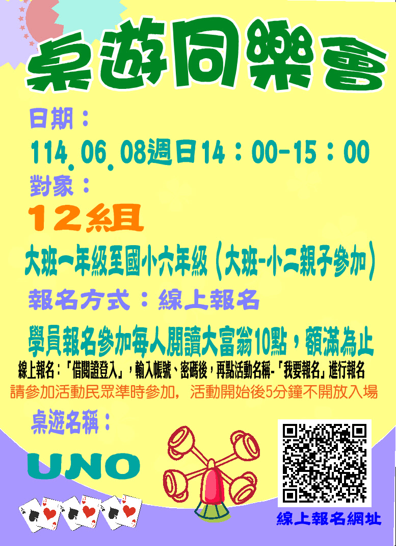 桌遊名稱:UNO 參加對象:12組親子大班至國小六年級(大班-小二親子參加) 三年級-六年級可自行參加,報名時姓名請填小朋友名字, (一位小朋友為一組,如有二位小朋友參加請填二組) 報名方式:線上報名 「借閱證登入」,輸入帳號、密碼後,再點活動名稱-「我要報名」進行報名 學員報名參加每人閱讀大富翁10點,額滿為止 **請參加活動民眾準時參加, 活動開始後5分鐘不開放入場**