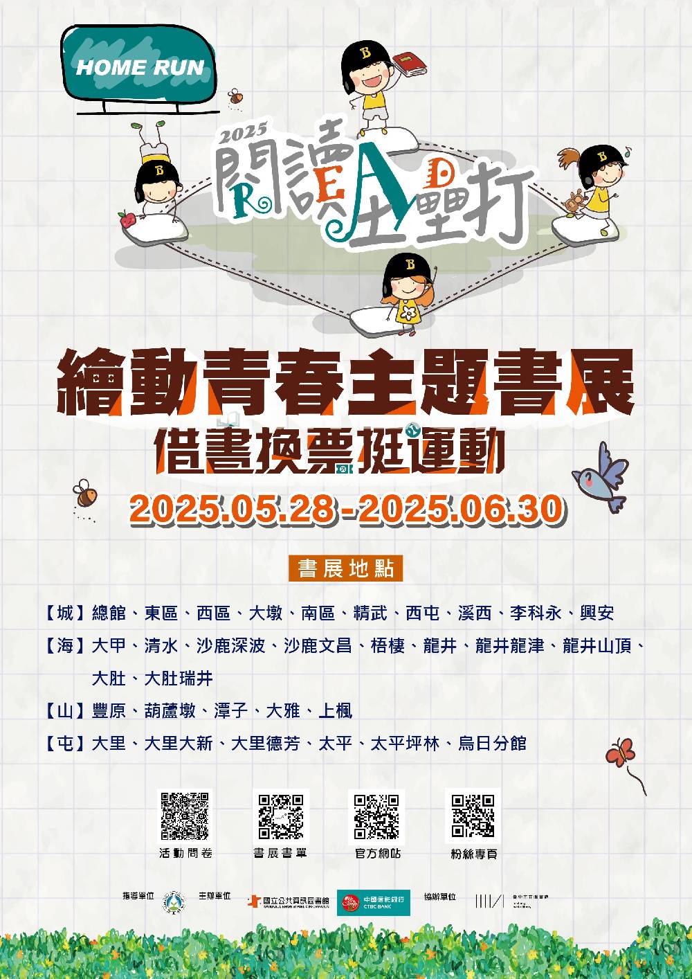 配合市圖辦理2025閱讀全壘打「繪動青春」主題書展,期盼透過繪本與故事的力量,點燃年輕世代的想像力與行動力,讓閱讀成為青春成長中不可或缺的精彩篇章。另有閱讀全壘打任務活動-借書換票挺運動,歡迎參加。