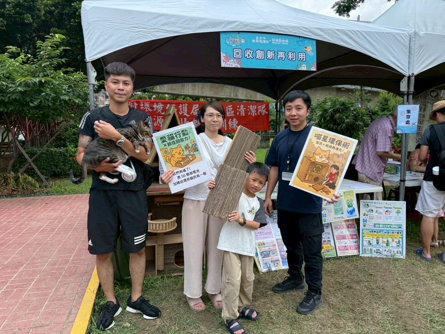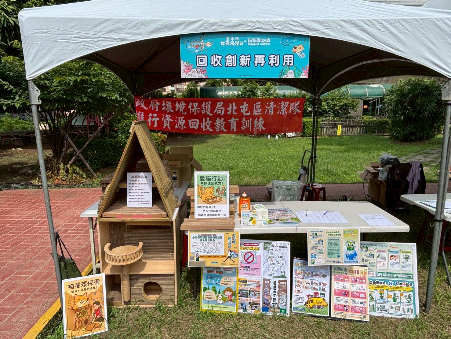 北屯區清潔隊長宋寶瑞表示,隨著網購興起,大量廢棄紙箱湧現,成為社區常見的回收物,為讓這些資源再生利用,北屯區清潔隊收集近百個廢棄紙箱,製作出30個環保貓抓板;民眾只要繳交50顆廢電池,就能兌換1個由回收紙箱手工製成的環保貓抓板。透過此次活動展示的貓屋巧妙融合廢棄家具與回收素材,激發愛貓民眾對居家廢棄物再利用的想像與創意,另也透過有獎徵答與互動講解,引導民眾反思日常生活中的垃圾產生,進而轉化為可再利用的資源。