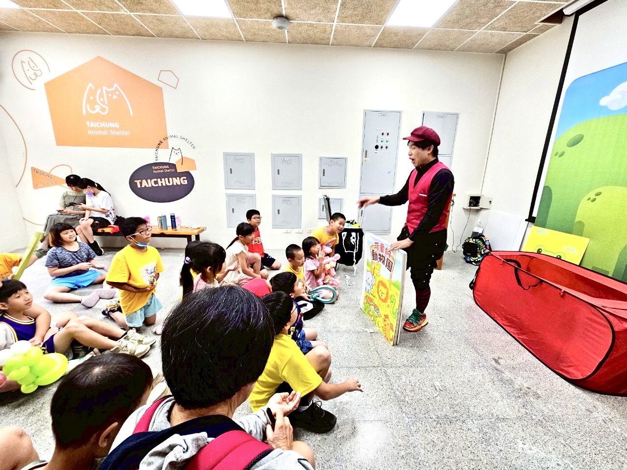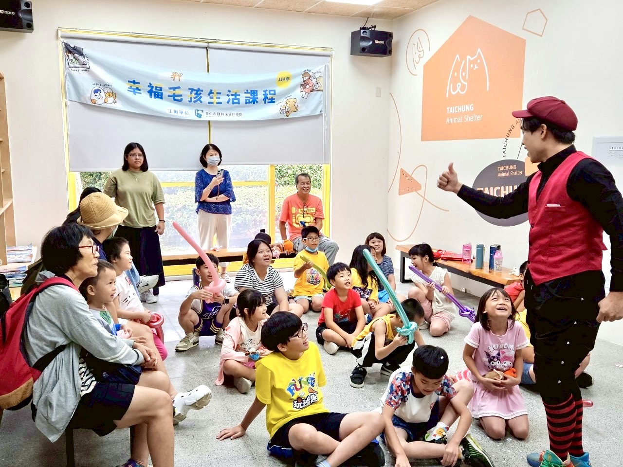 學齡前與國小階段是孩子性格及價值觀養成的重要時期,動保處在一系列幸福毛孩生活課程中特別規劃適合親子共學的課程,邀請親子教育專家的王國欽老師,透過專屬設計的「調皮的狗皮皮」故事,帶領孩子們進入冒險旅程,認識流浪動物產生的原因與如何成為負責任的飼主。在故事時間裡,孩子們聆聽皮皮流浪期間的冒險與挑戰,學習珍惜家人與幫助別人;「跟著皮皮動起來」單元中,孩子們隨著音樂和節奏一起拍手、跳躍,將劇情化作動作遊戲,充滿笑聲與活力;特別安排的「皮皮奇遇記・魔術師時間」更讓孩子們在驚喜中體驗動物與人之間建立信任的重要;最後透過「跟著皮皮一起學習」,帶孩子們回顧今天的學習重點,將關懷動物、遠離危險與守護生命的觀念帶回日常生活中。